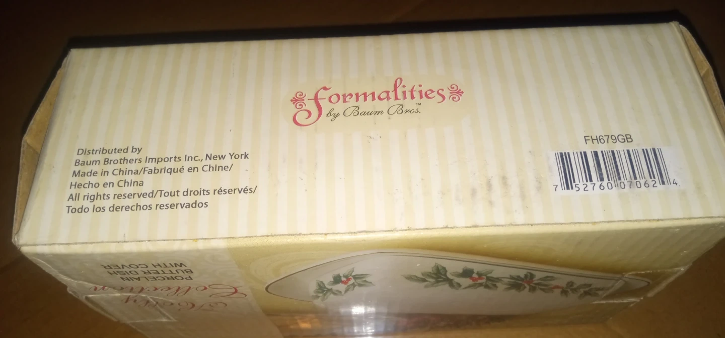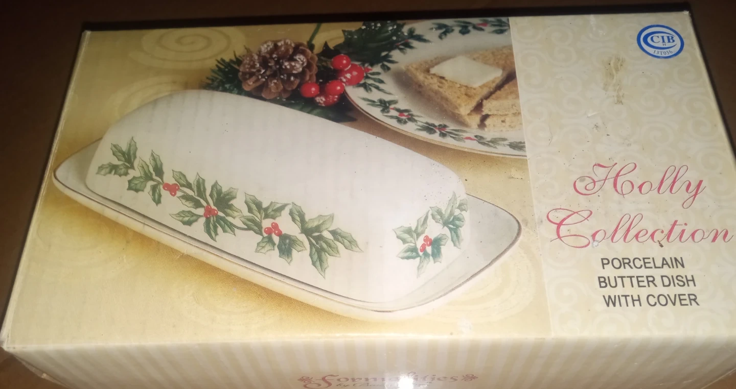 This is a porcelain butter dish with a cover from the Holly Collection by Baum Bros. It's decorated with a festive holly pattern. Dishwasher safe.