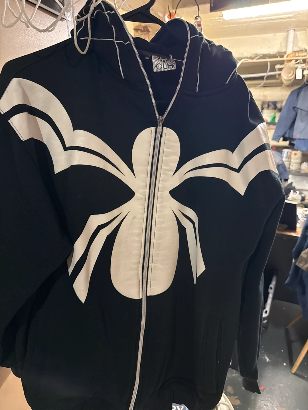 Selling a black OLH full zip hoodie with a Spider-Man design! It's in great condition and features a unique web pattern on the hood. The material is a comfortable blend of 60% cotton and 40% polyester. Perfect for any Spider-Man fan!