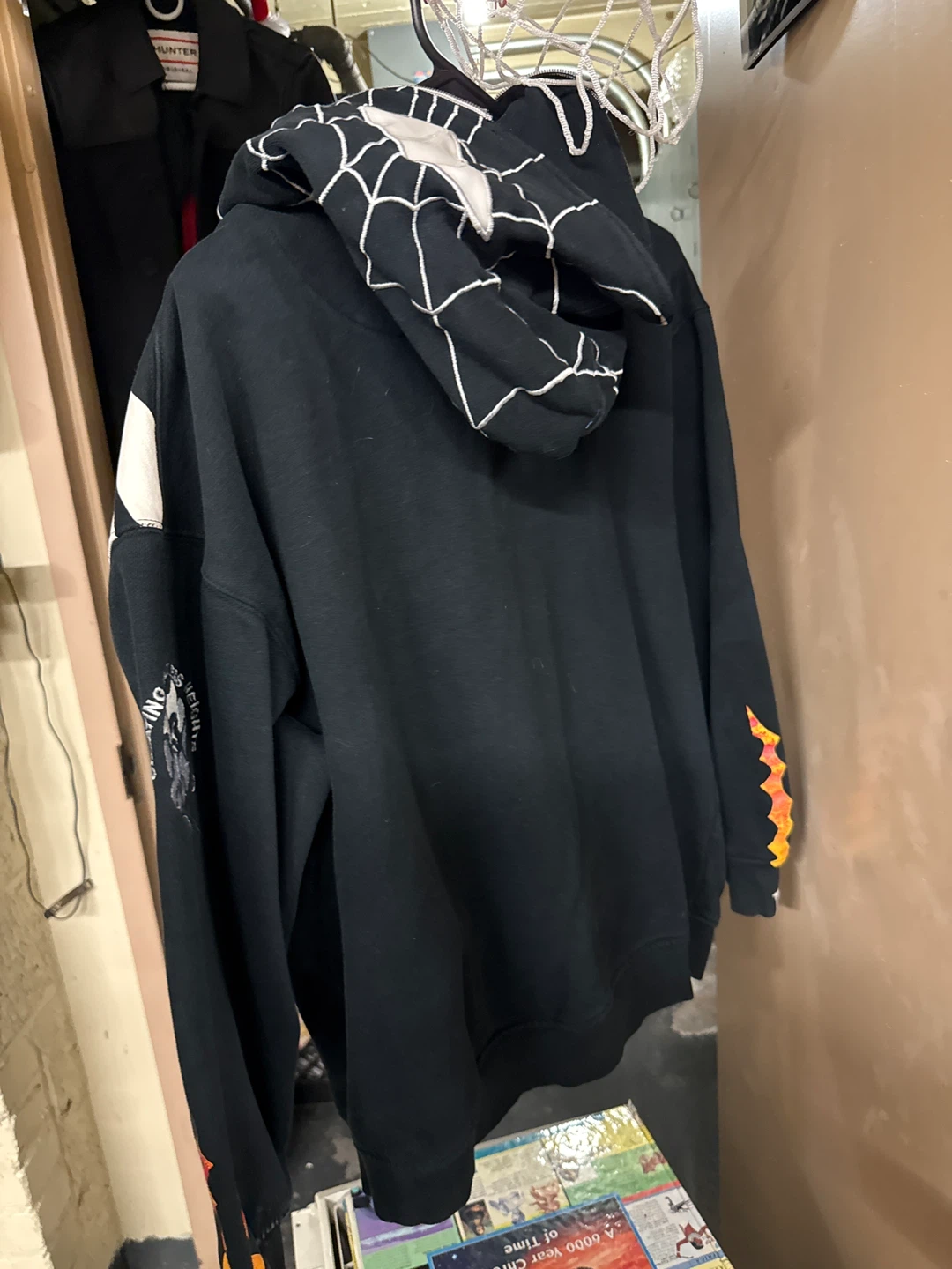 Selling a black OLH full zip hoodie with a Spider-Man design! It's in great condition and features a unique web pattern on the hood. The material is a comfortable blend of 60% cotton and 40% polyester. Perfect for any Spider-Man fan!