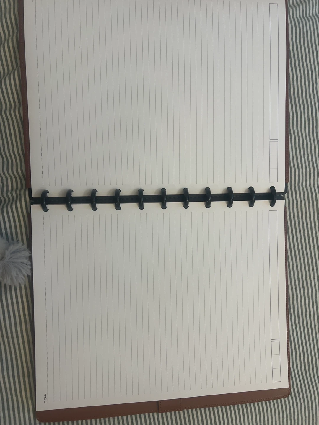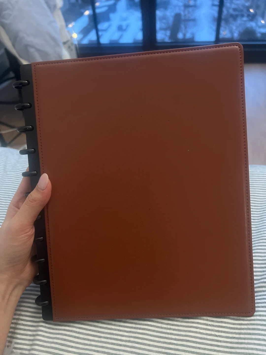 This TUL discbound notebook features a durable brown faux leather cover. It is brand new, lays flat, and has a flexible disc binding system for easy page removal and addition. The interior pages are lined and ready for your notes or planning needs. Also features inner sleeve pockets and pen holder slot on inside of covers.