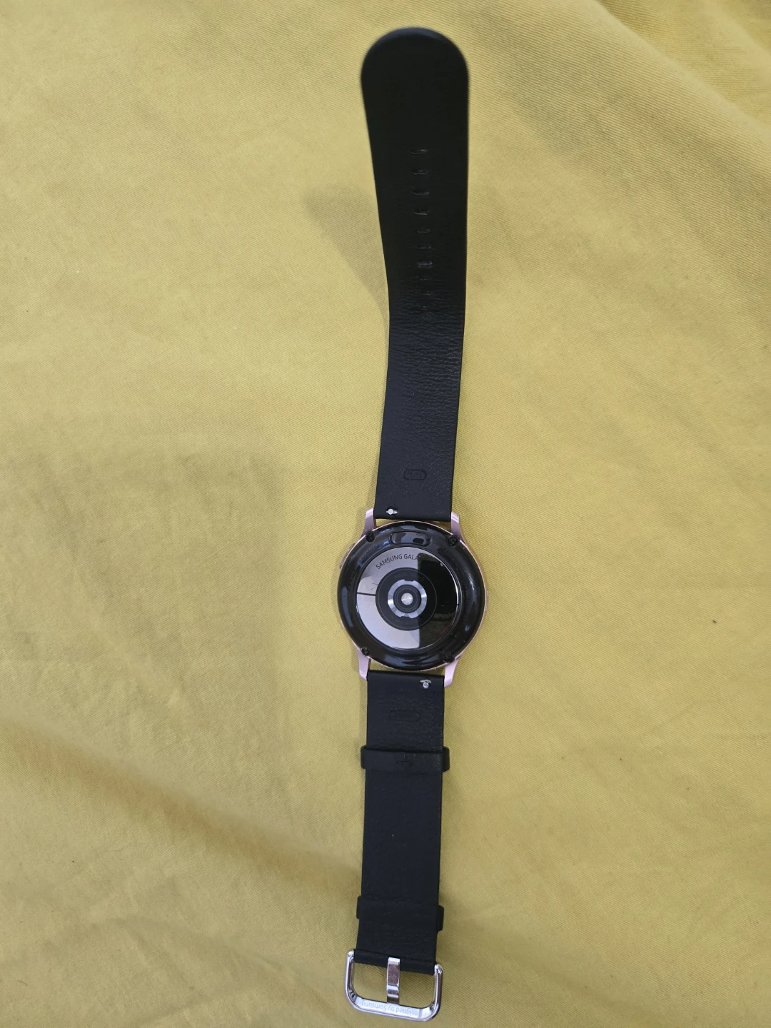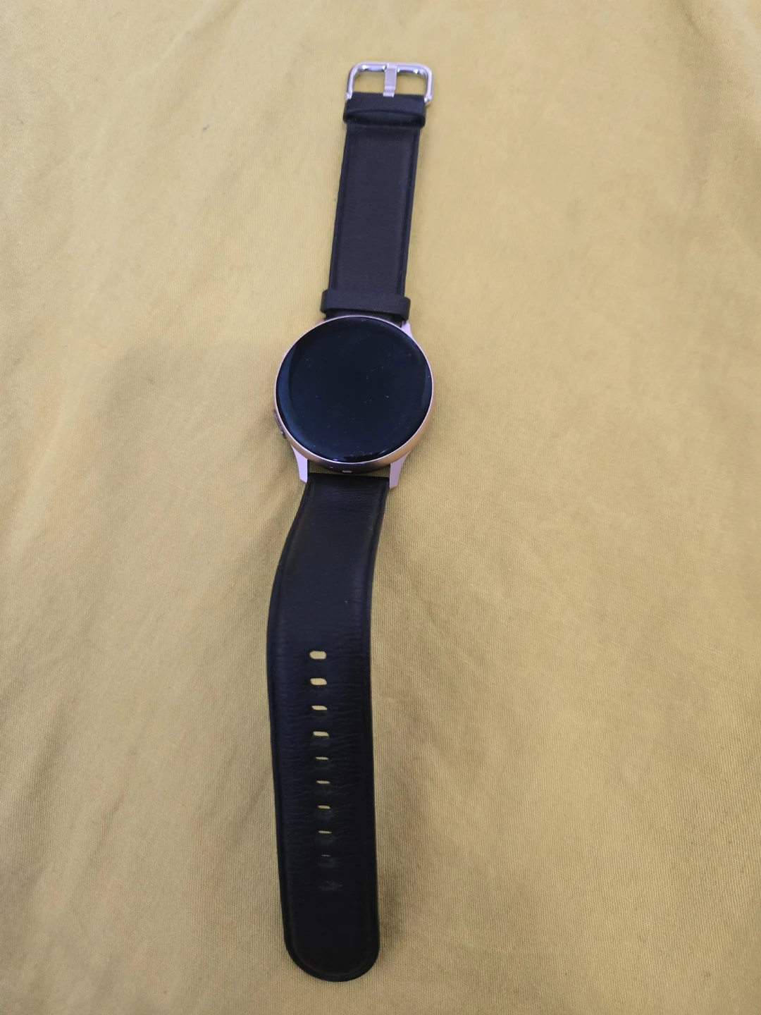 This Samsung Galaxy Watch is a rose gold smartwatch with a black leather band. It's a stylish and functional accessory for your wrist. This watch is a great everyday companion.