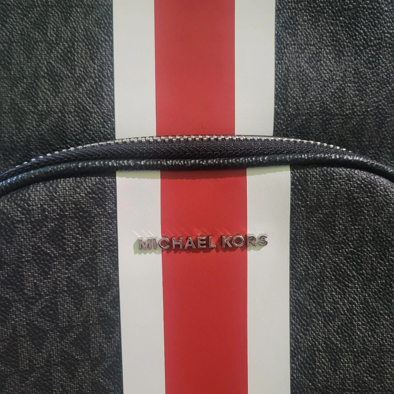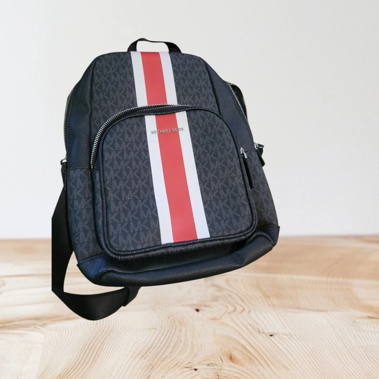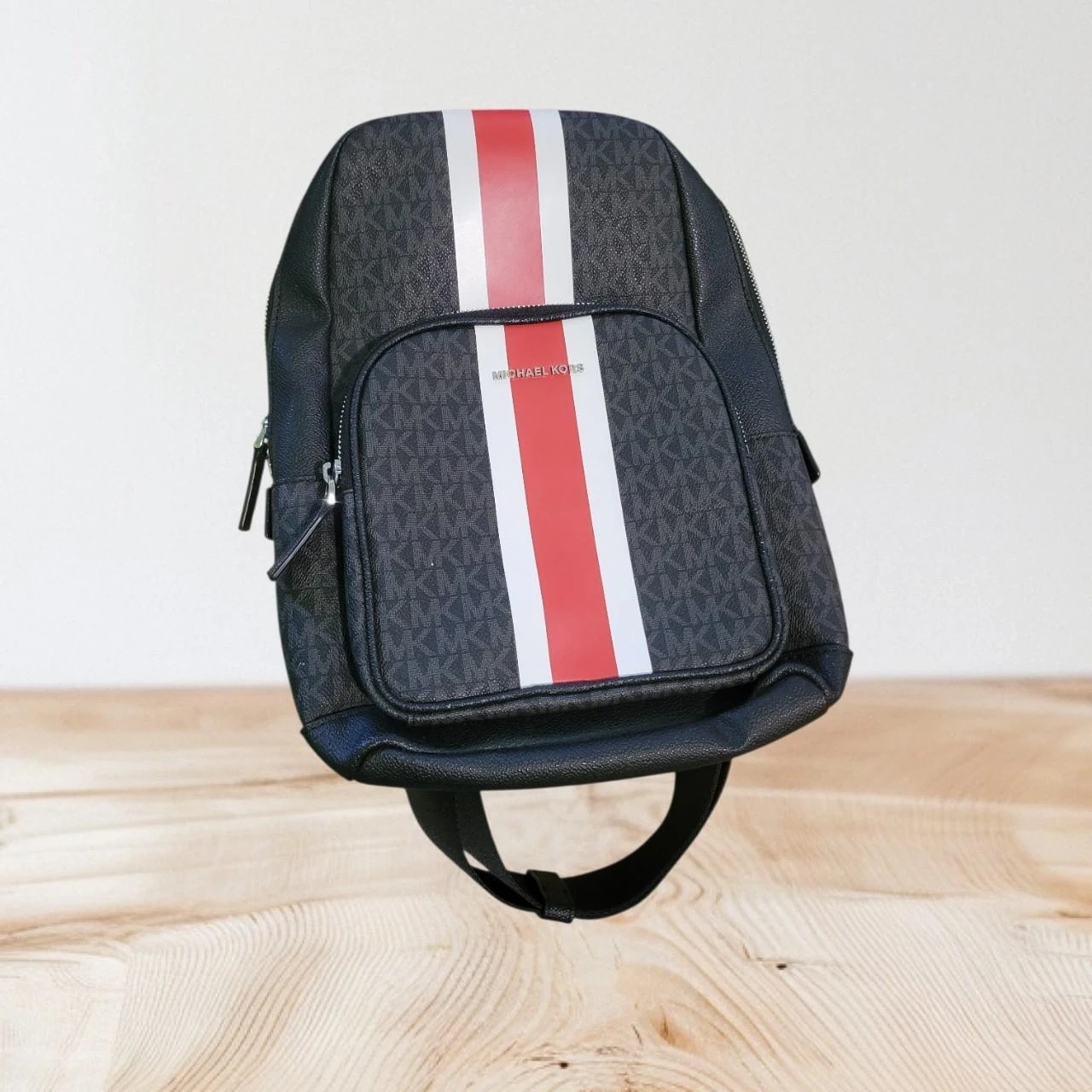 This Michael Kors backpack features the signature MK pattern in black. It has a front zip pocket with red and white stripes. The interior is lined with fabric and includes a brand tag.