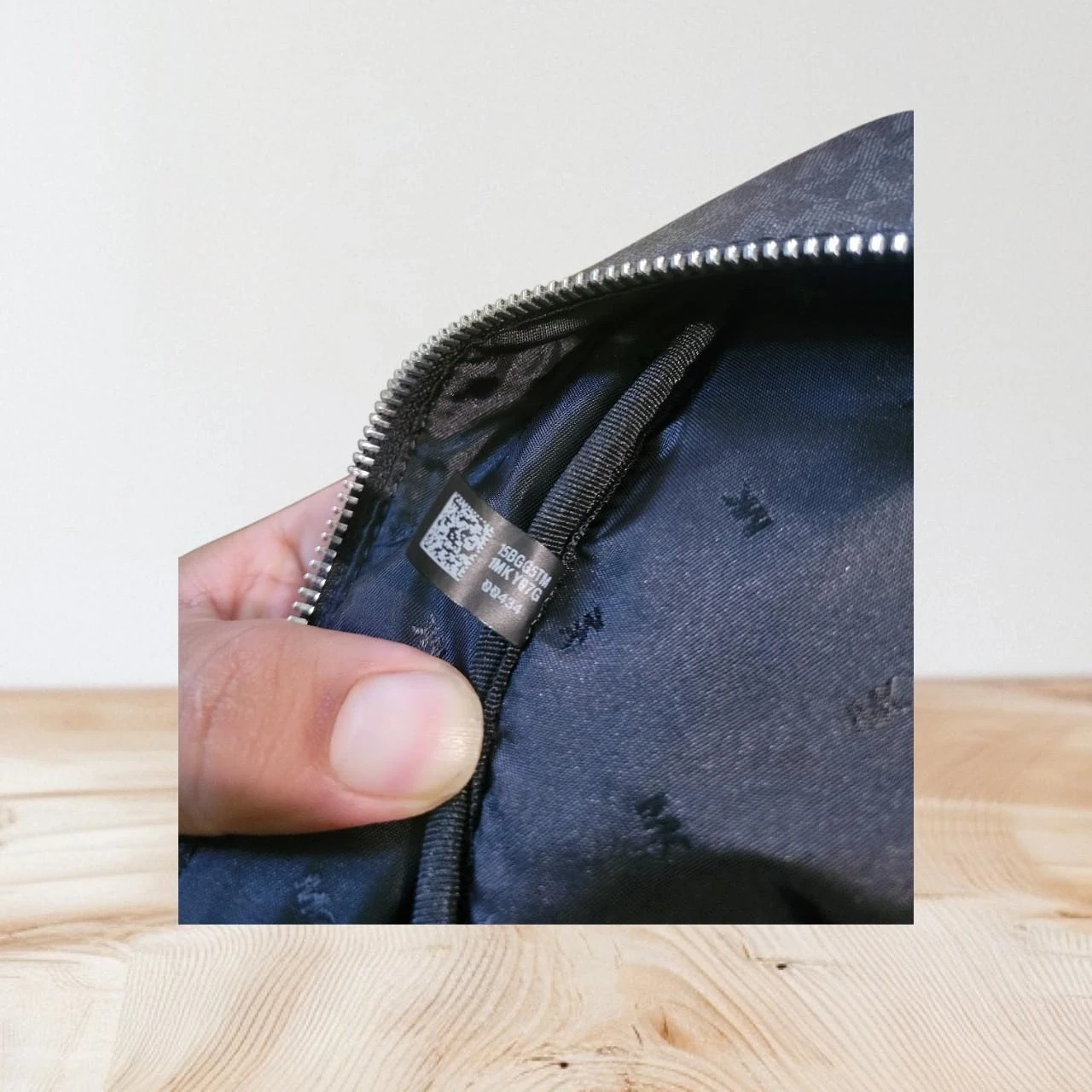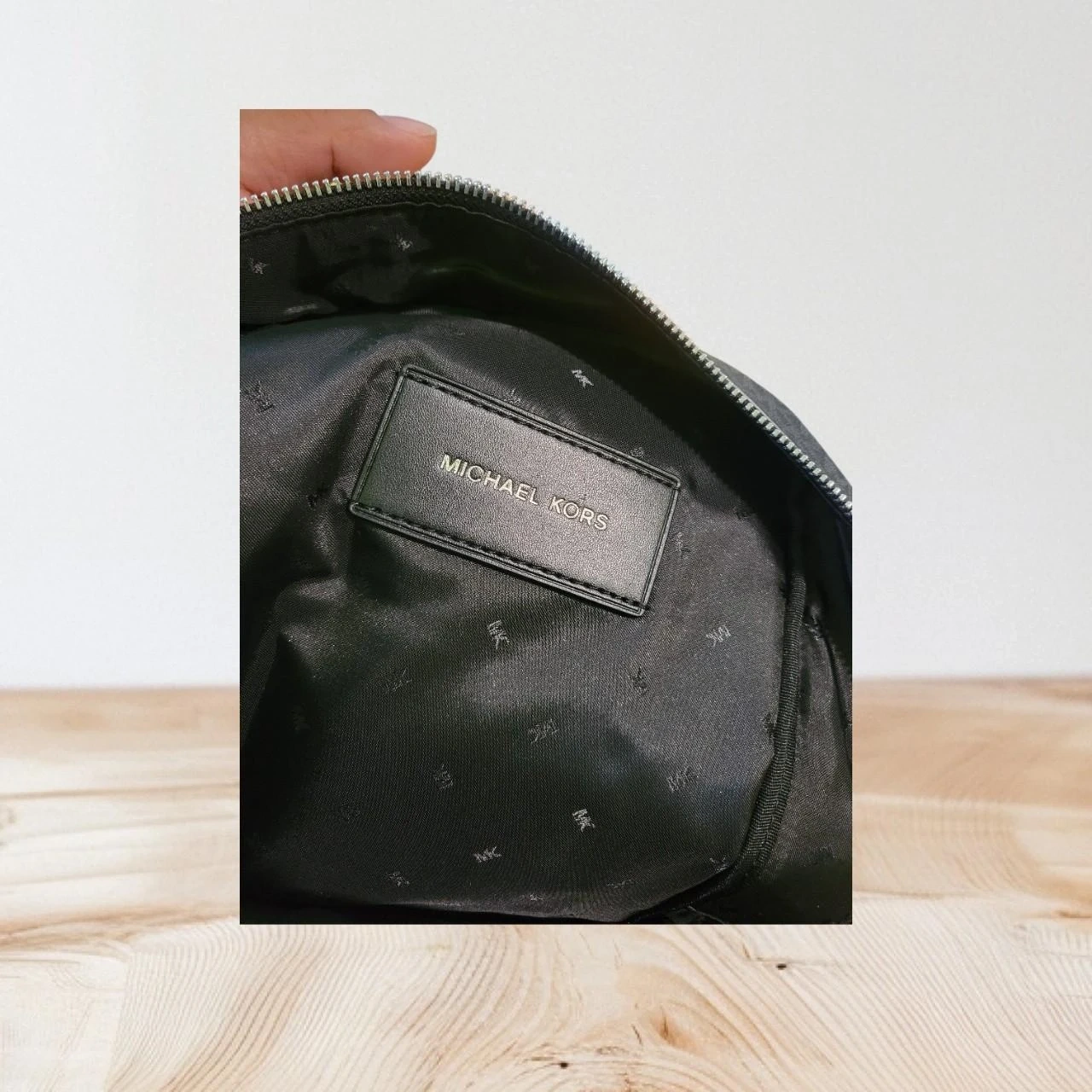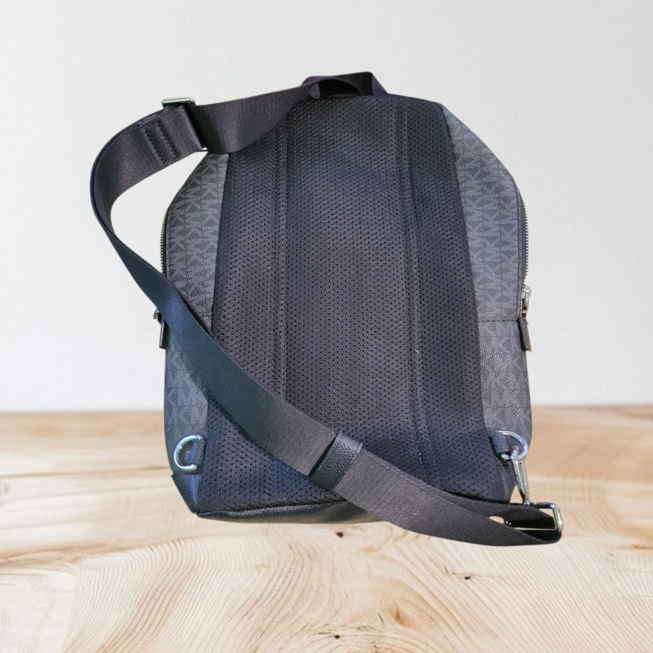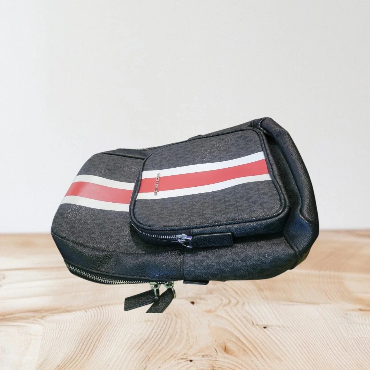 This Michael Kors backpack features the signature MK pattern in black. It has a front zip pocket with red and white stripes. The interior is lined with fabric and includes a brand tag.