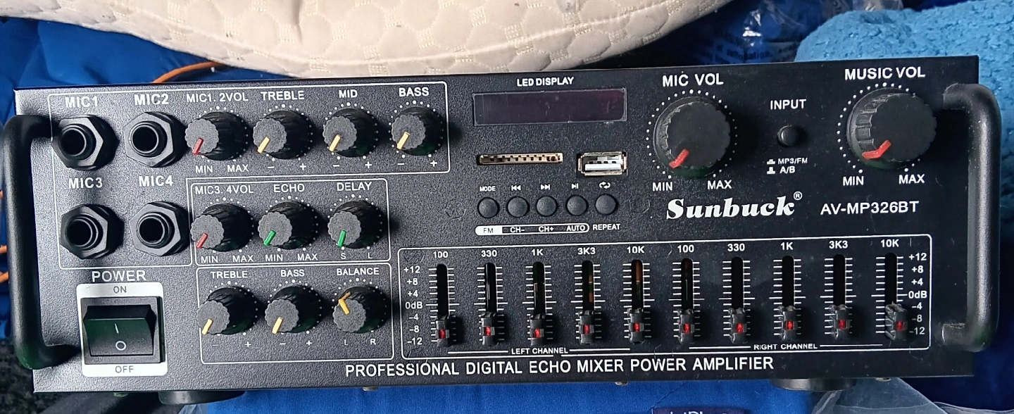 Selling a Sunbuck AV-MP326BT Bluetooth stereo amplifier. It supports USB disk and SD cards. It is a professional digital echo mixer power amplifier.