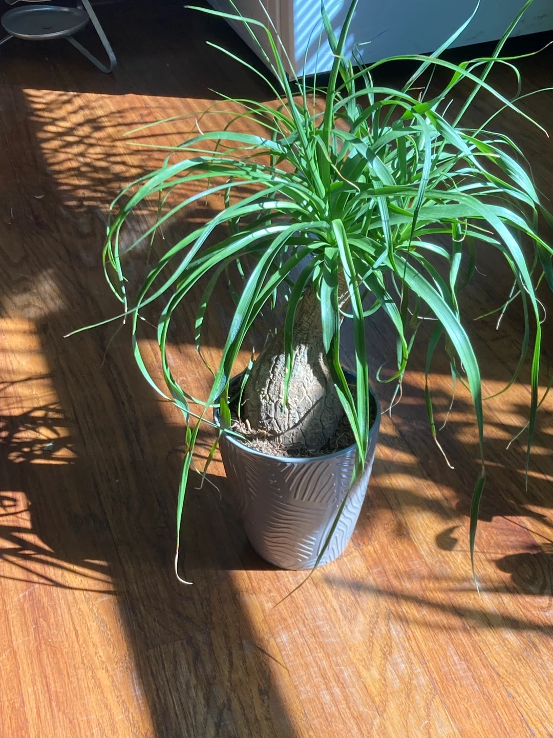 This ponytail palm plant features a distinctive bulbous base and long, arching green leaves. It's housed in a textured gray pot with a subtle wave pattern. This plant requires minimal watering and is great for bright indoor spaces.