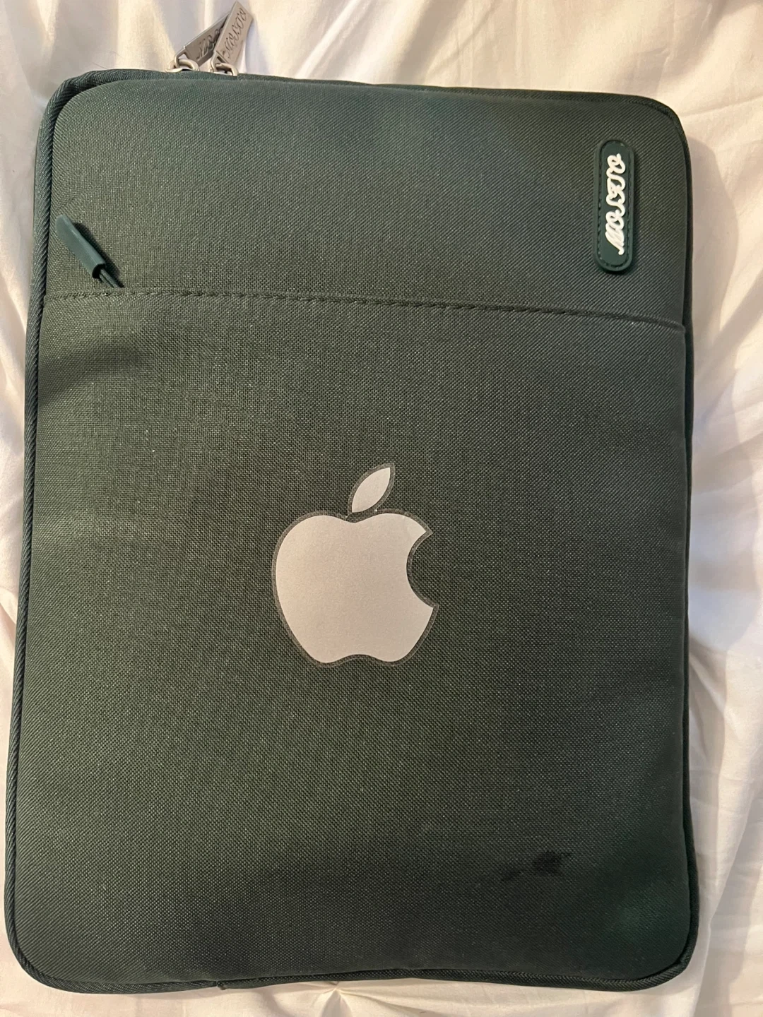 Stylish green Apple laptop sleeve. It is in good condition and has a front pocket for accessories. Perfect for protecting your laptop on the go! Compatible with any 13 inch laptop.