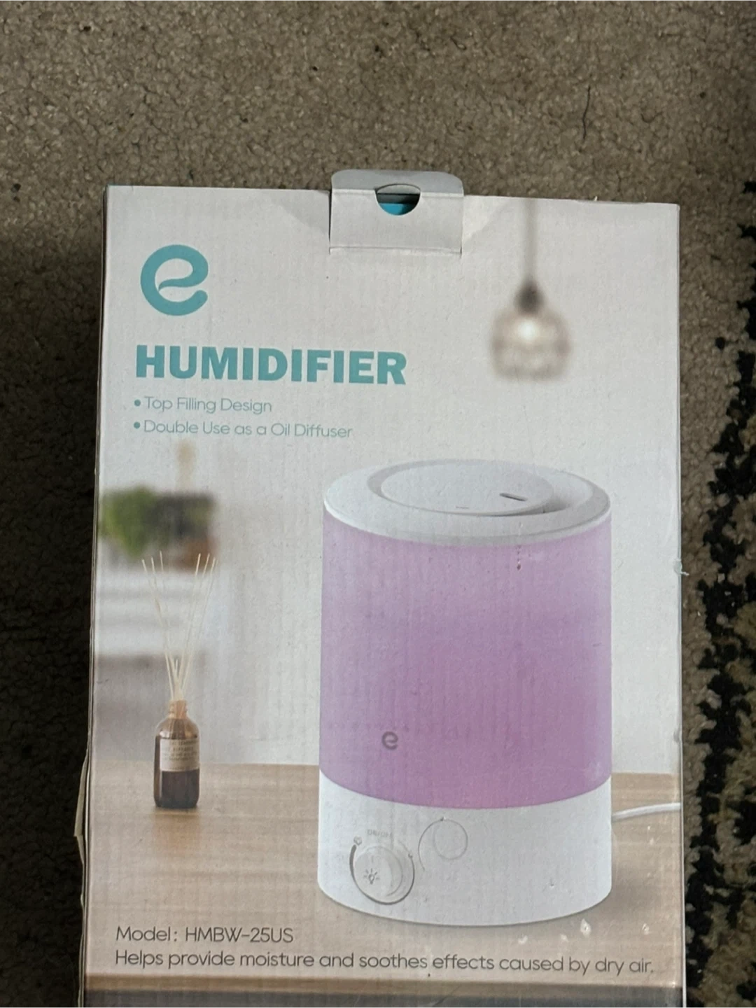 This is an e Humidifier with a top filling design. It also doubles as an oil diffuser. Model HMBW-25US. Helps provide moisture and soothes effects caused by dry air.