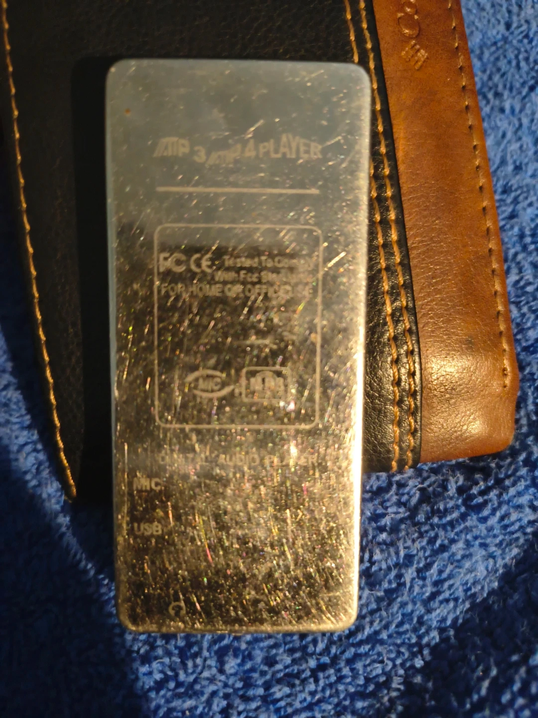 This is a portable MP3/MP4 player. It's black and silver. Device has a screen for viewing content. USB connection available for charging and data transfer.