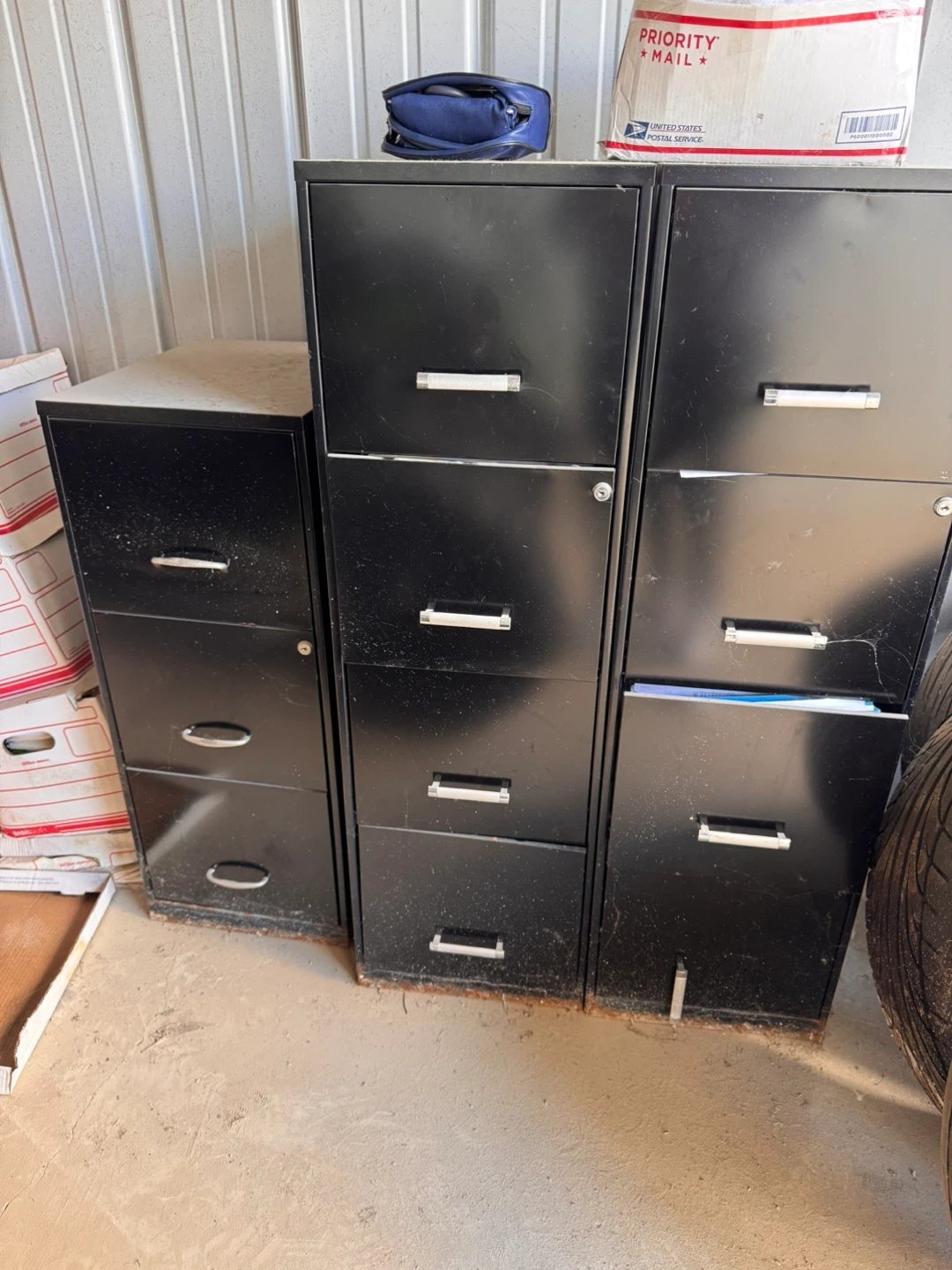 Selling a set of black filing cabinets. Great for office storage or organizing your documents at home. They show some signs of use, but they're still functional and ready to help you get organized