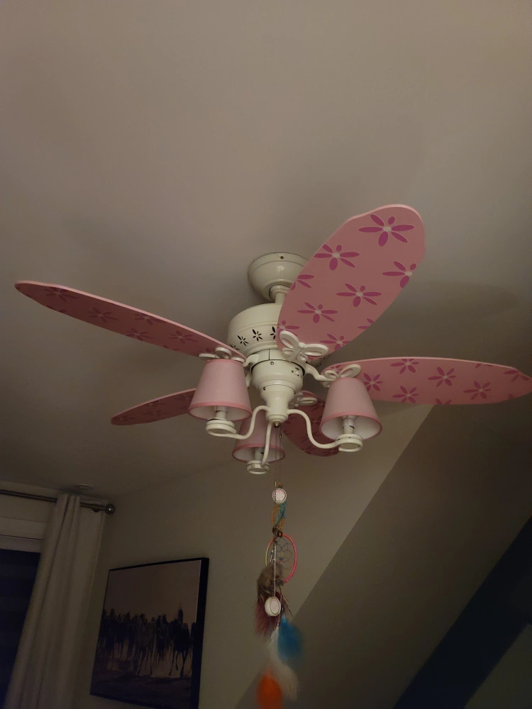 Selling a cute ceiling fan with a pink floral design! It's perfect for a kid's room or any space that needs a touch of whimsy. The fan includes lights and a decorative . It's in great condition and ready to brighten up your home