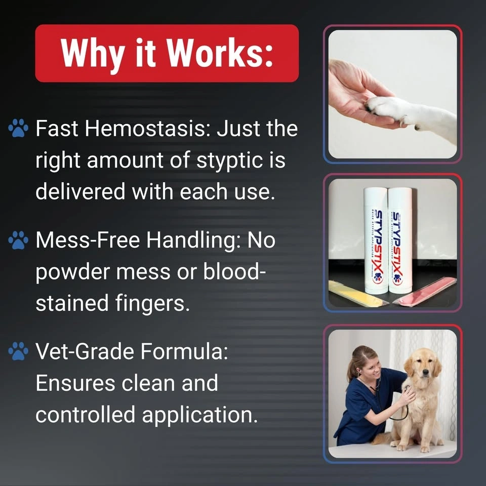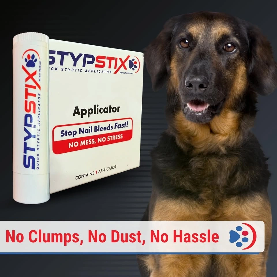 Essential styptic applicator for your furry friends. This STYPS TIX stick stops nail bleeds fast for cats and dogs. Super easy to use, no mess or stress. Has a vet-grade formula. Great for pet parents and groomers.