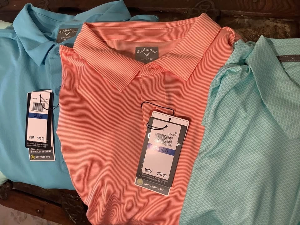 Stylish and comfortable Callaway opti-dry performance stretch golf polos in Mens size XL. Ideal for casual outings on or off the golf course. All are Brand new with tags and Retail is $70. Part of my father’s collection of XL and XXL golf wear, much never worn! I have more in XL and XXL if u r looking!