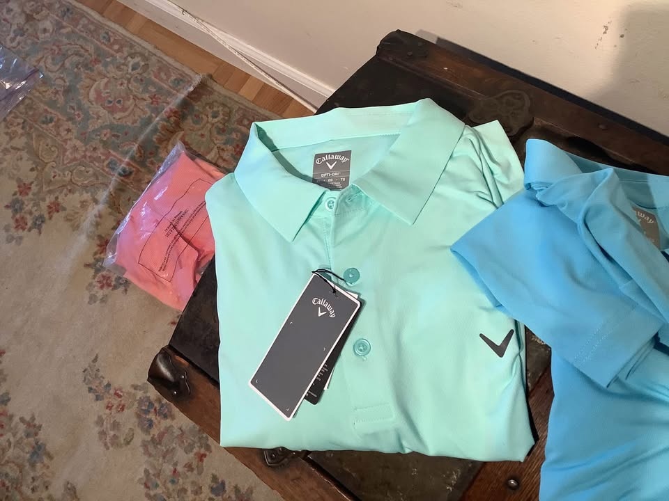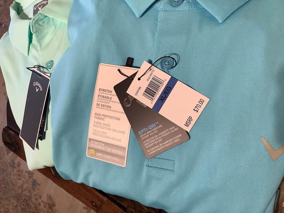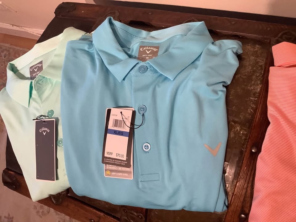 Stylish and comfortable Callaway opti-dry performance stretch golf polos in Mens size XL. Ideal for casual outings on or off the golf course. All are Brand new with tags and Retail is $70. Part of my father’s collection of XL and XXL golf wear, much never worn! I have more in XL and XXL if u r looking!
