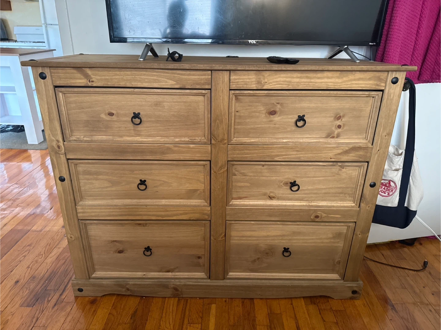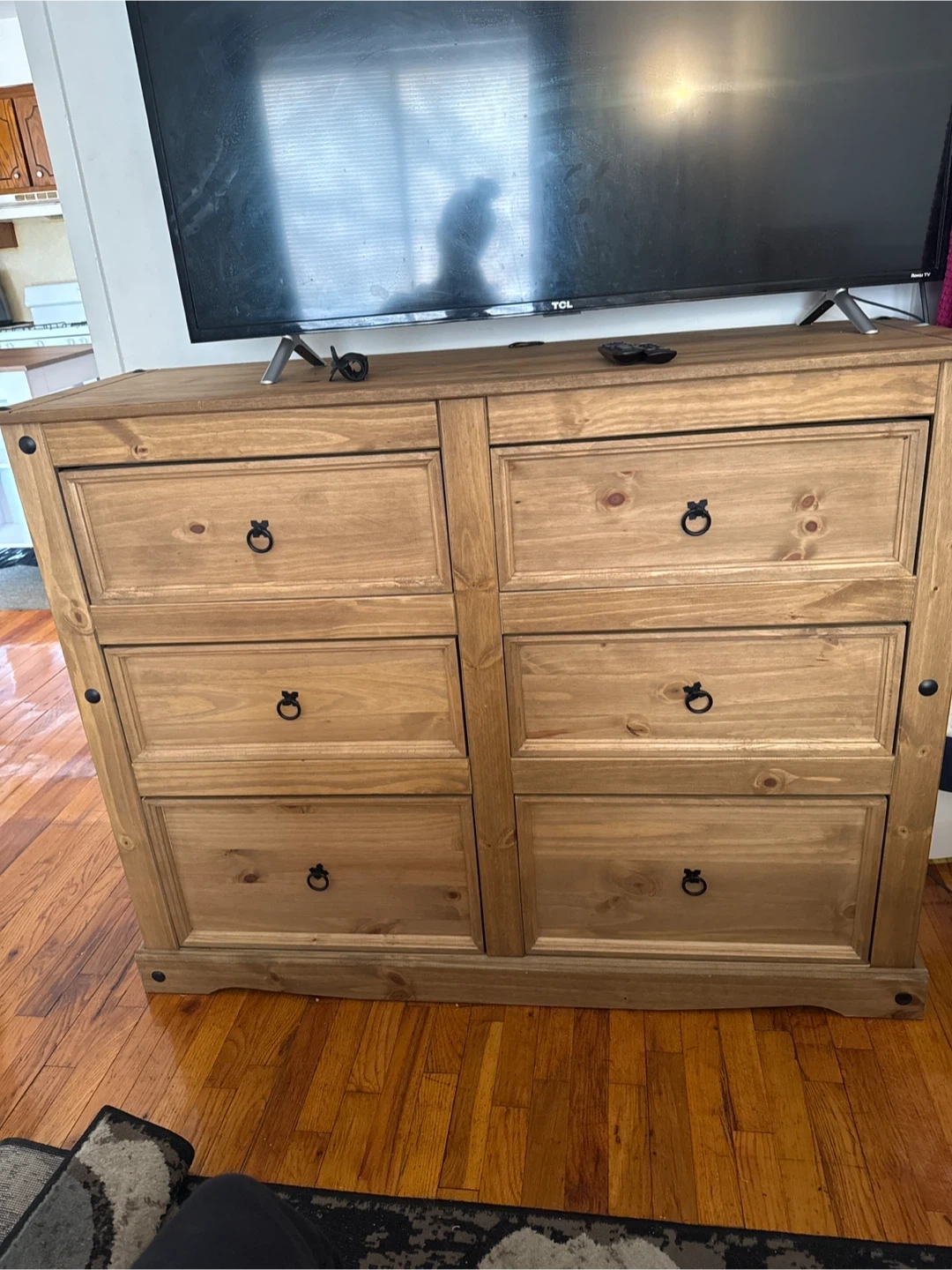 Solid wood 6-drawer dresser in a warm, natural finish. Features ring pull hardware on each drawer. It's perfect for storing clothes and accessories.
