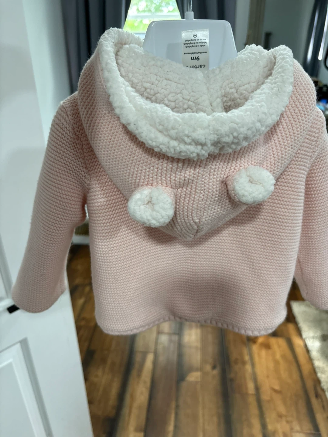 I have a Carter's baby jacket in size 9M. It's in great condition and ready for a new home! It has a hood and is perfect for keeping your little one warm and cozy.