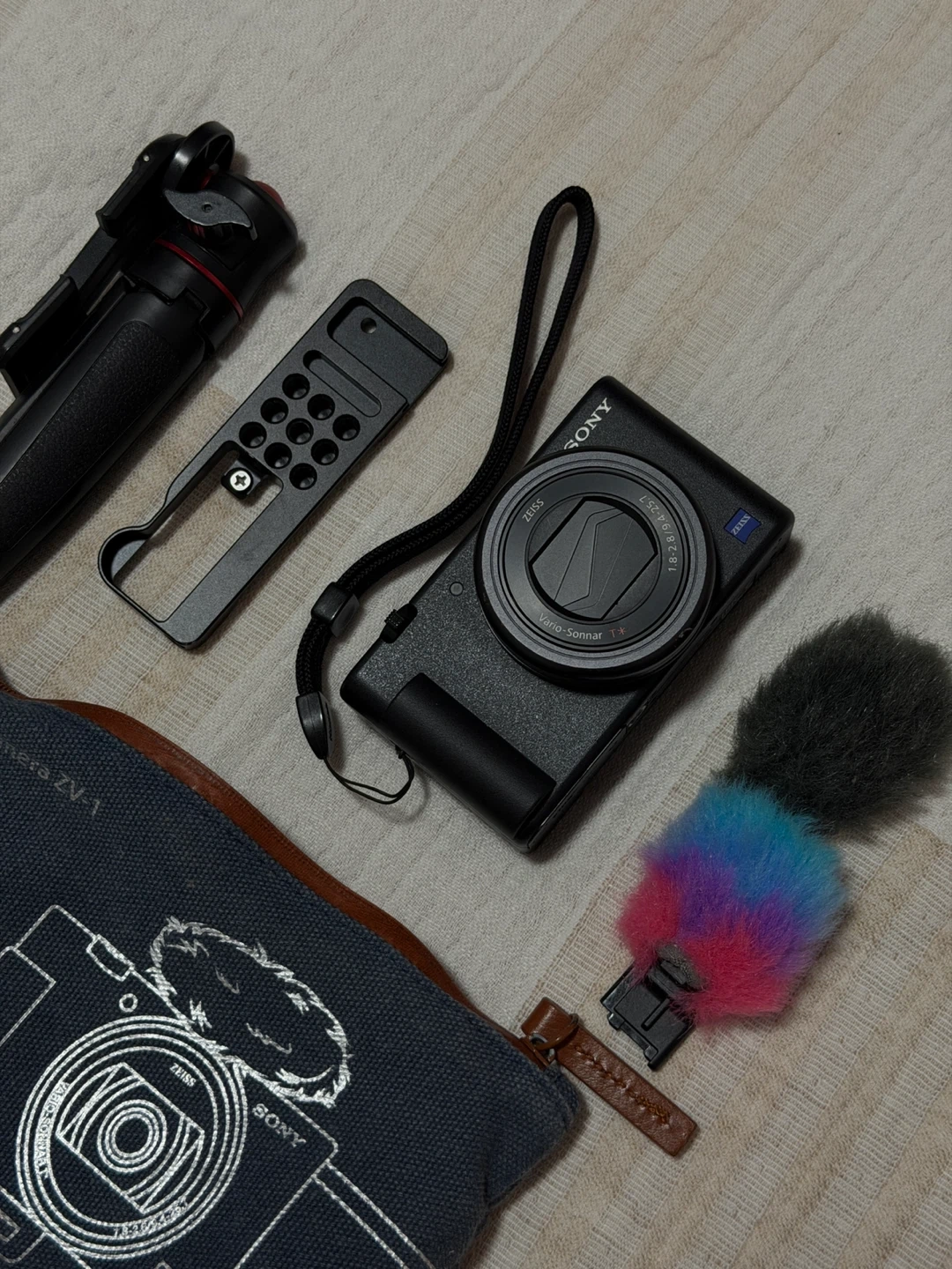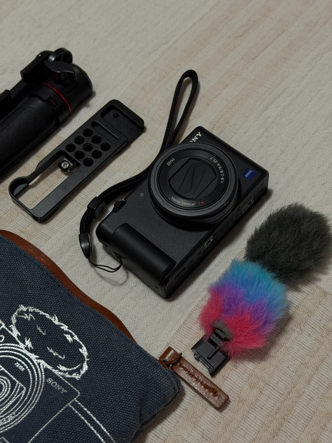 Compact black Sony ZV-1 digital camera with all these accessories. It's a versatile camera for vlogging and content creation. Features a Vario-Sonnar T* 24-70mm f/1.8-2.8 lens. Records in 4K resolution.