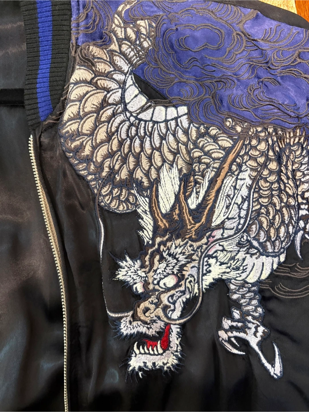 This bomber jacket features a detailed embroidered design of a dragon and tiger with cherry blossoms. The sleeves are a contrasting royal blue.