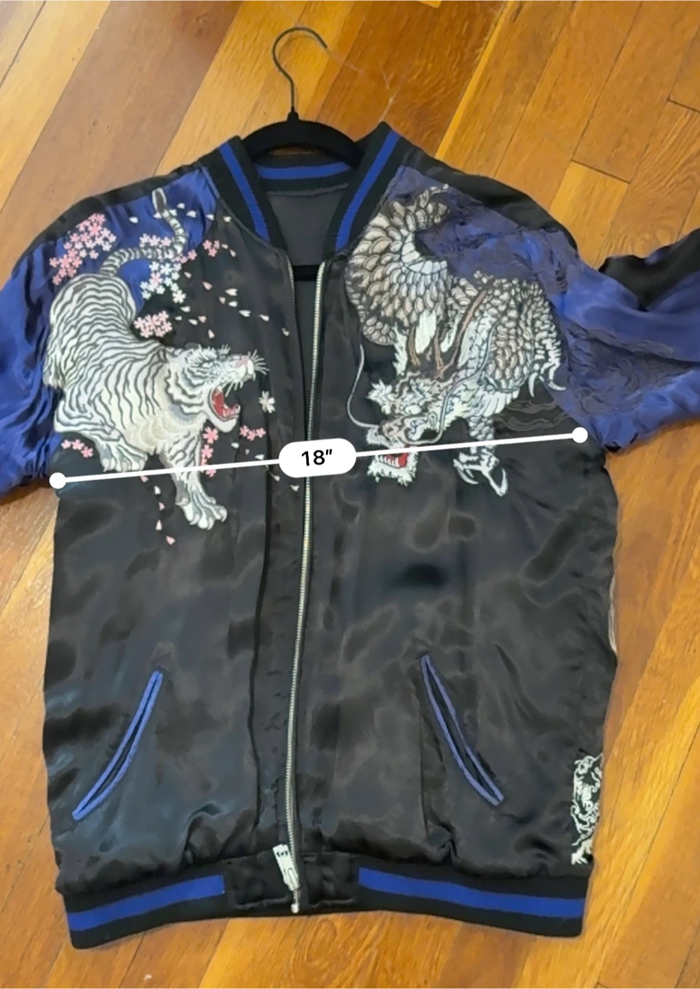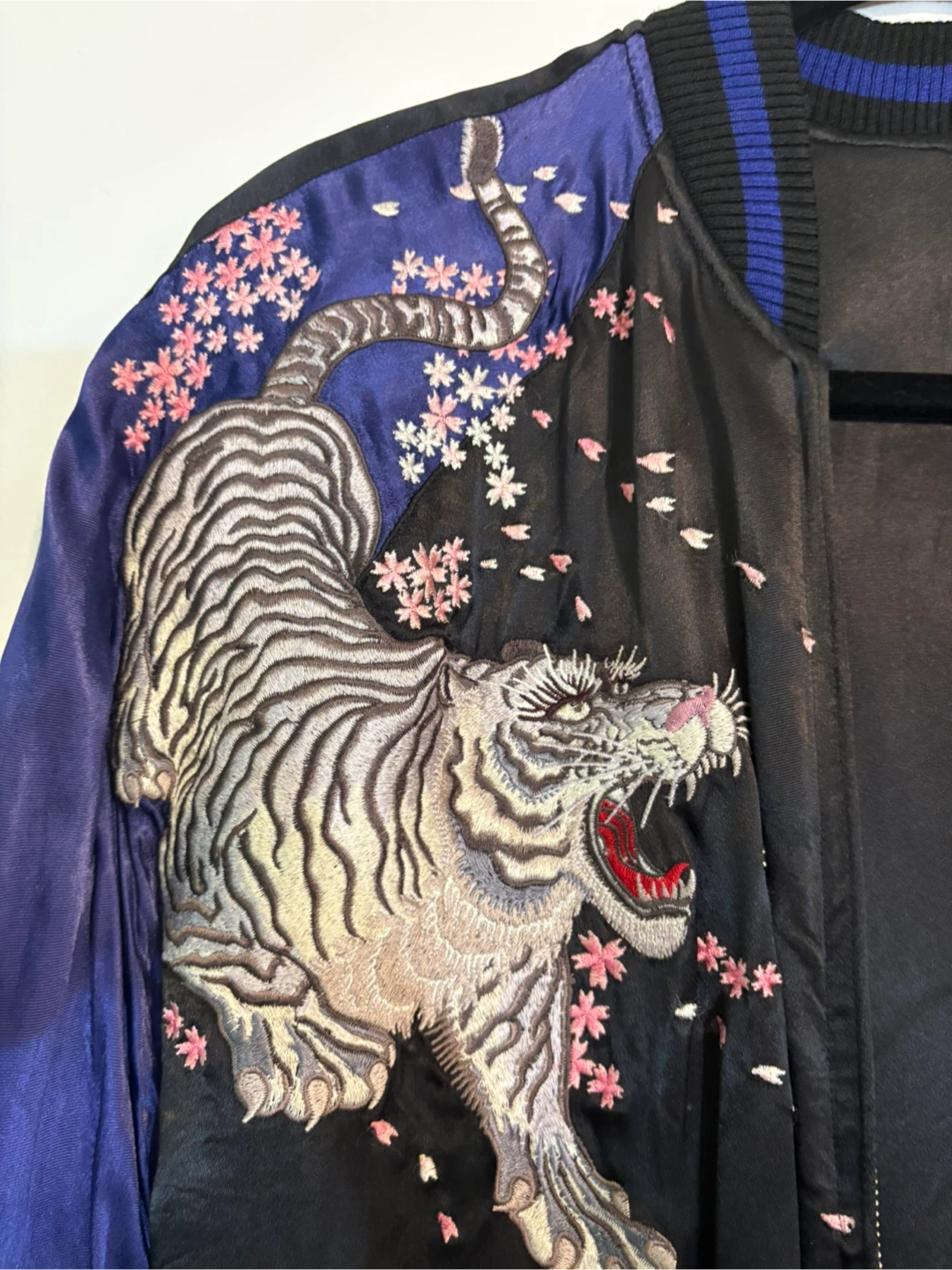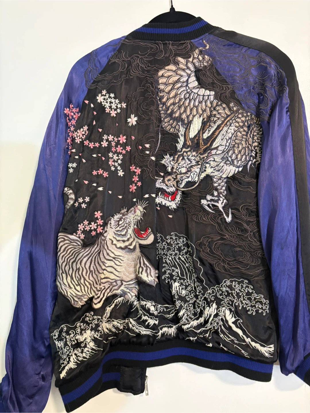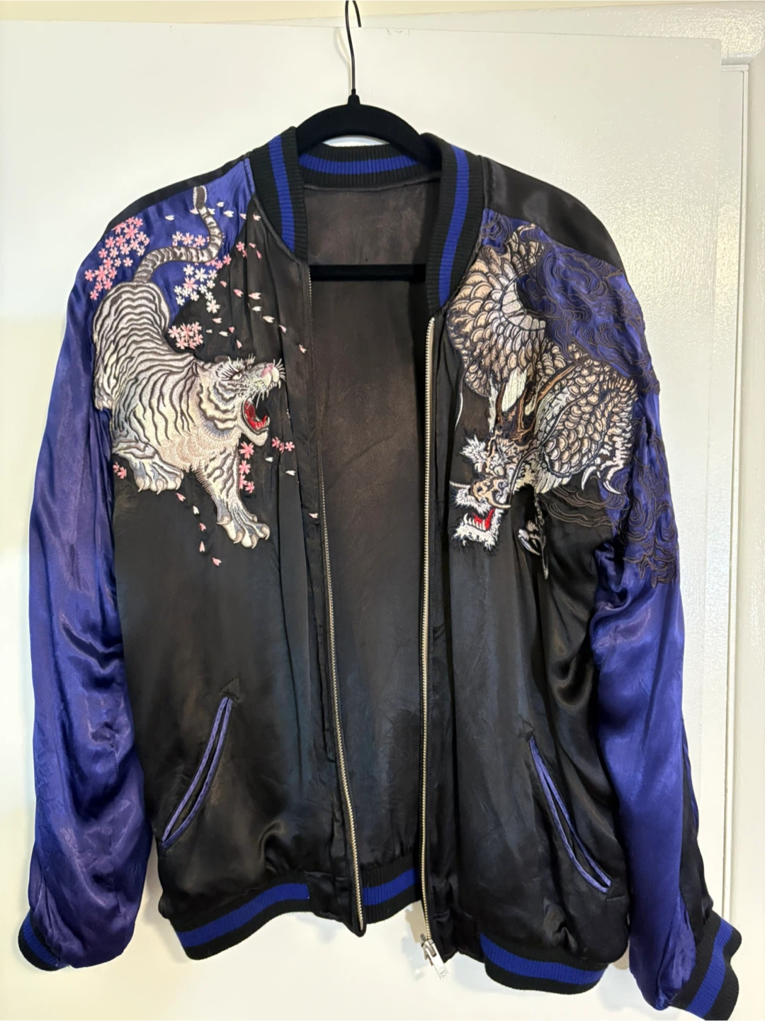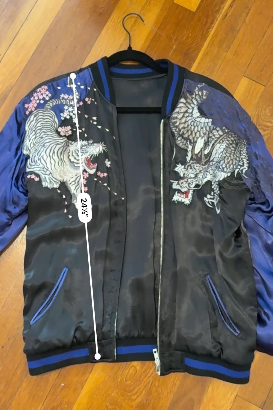 This bomber jacket features a detailed embroidered design of a dragon and tiger with cherry blossoms. The sleeves are a contrasting royal blue.