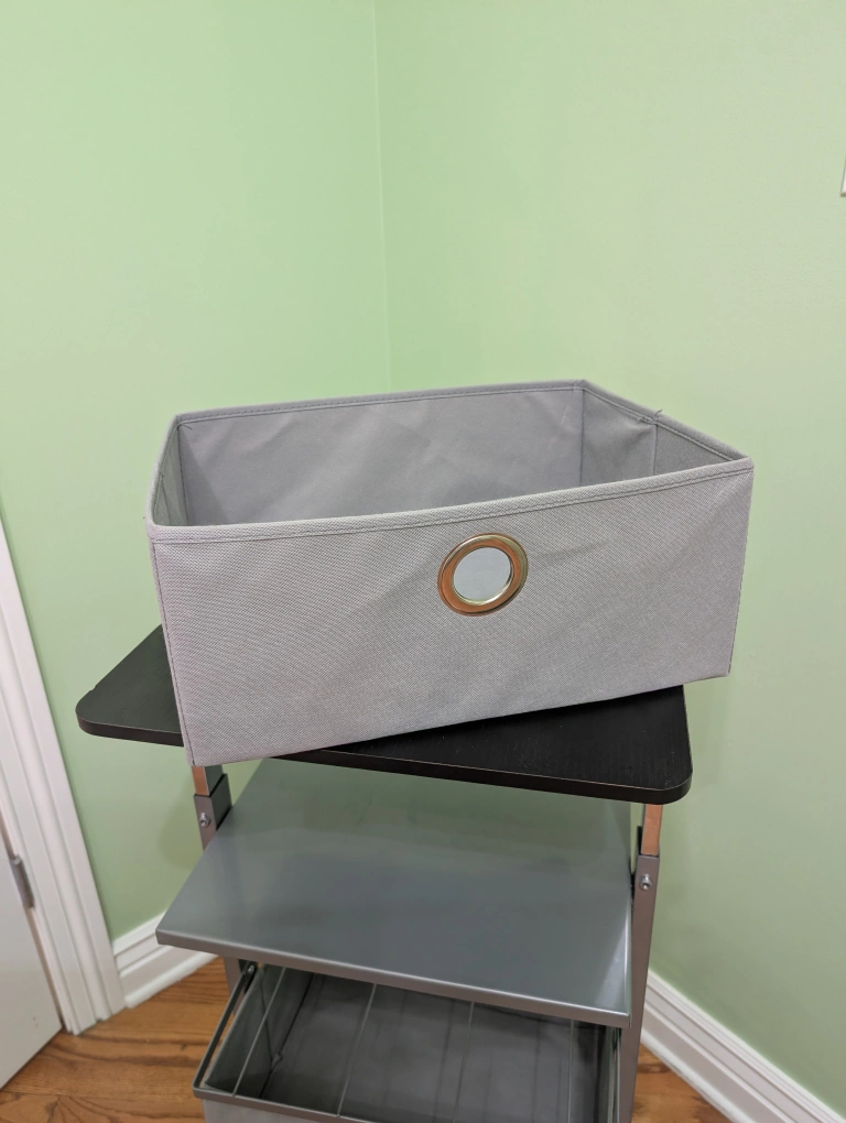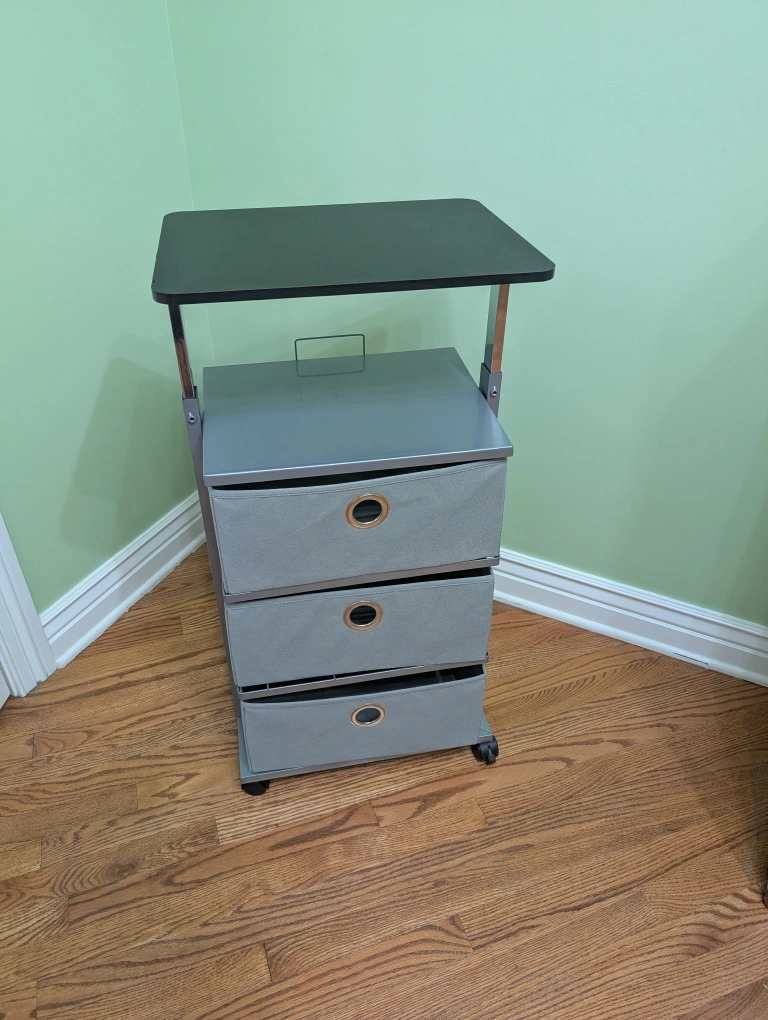 The cart has an adjustable top wooden surface that lowers to minimize space, a middle metal shelf, and three fabric drawers. Sitting on wheels, this storage solution is ready to move with you. It's in great condition and ready for a new home.
