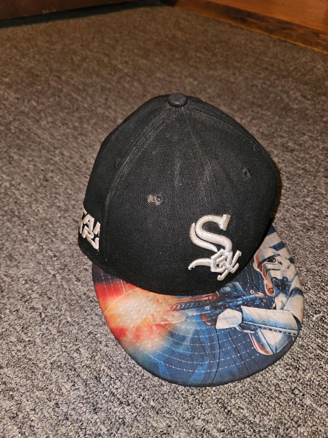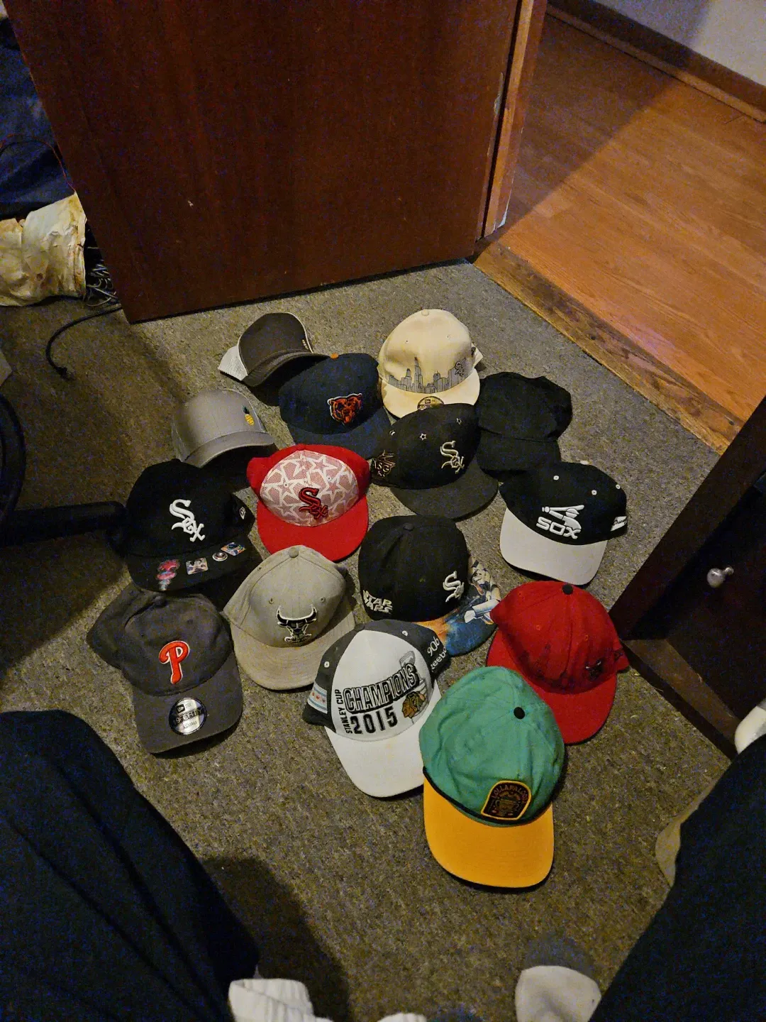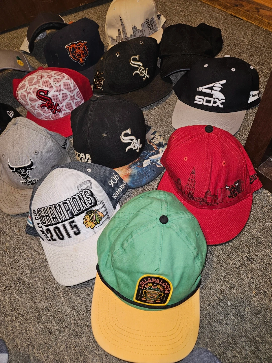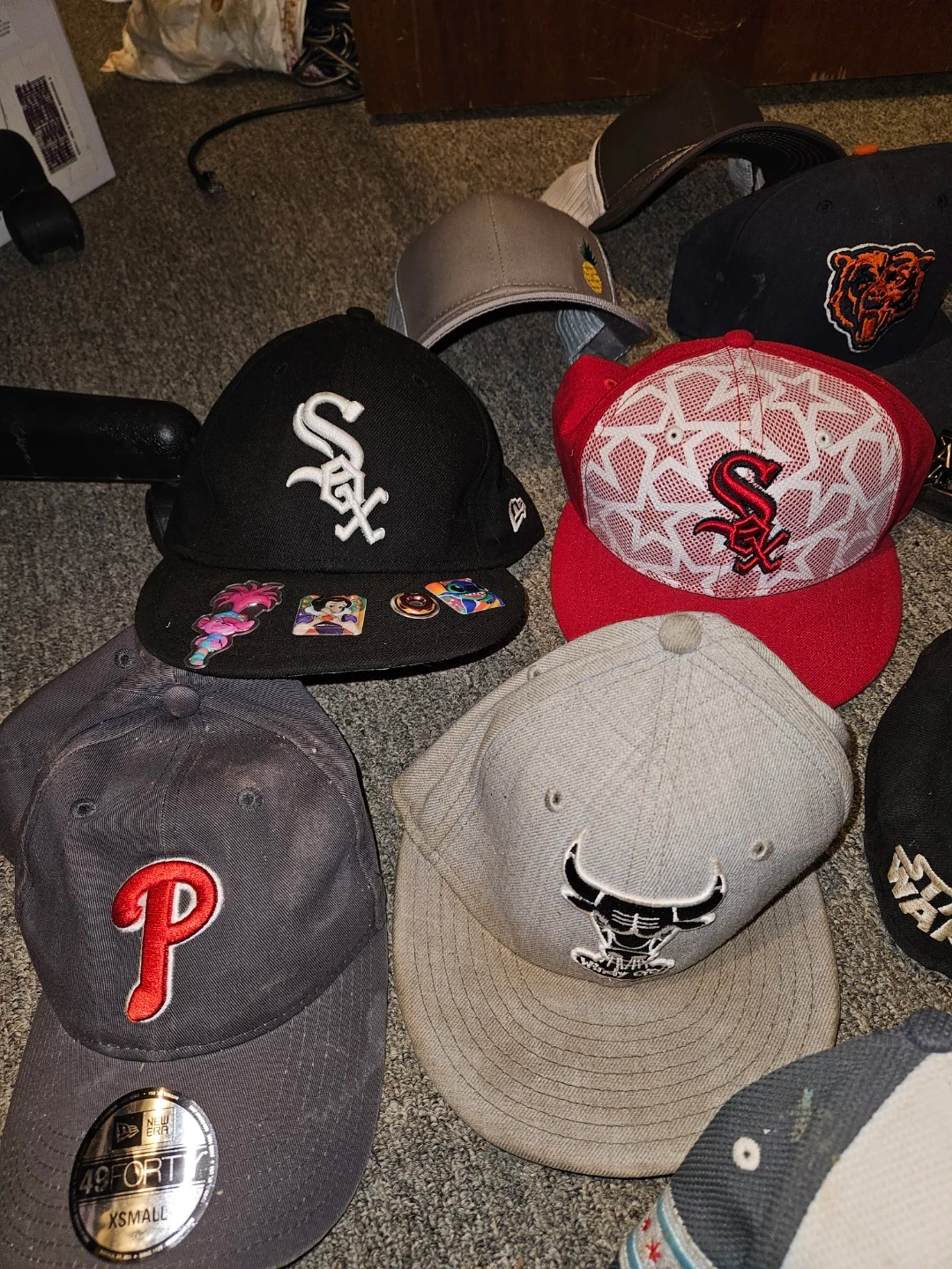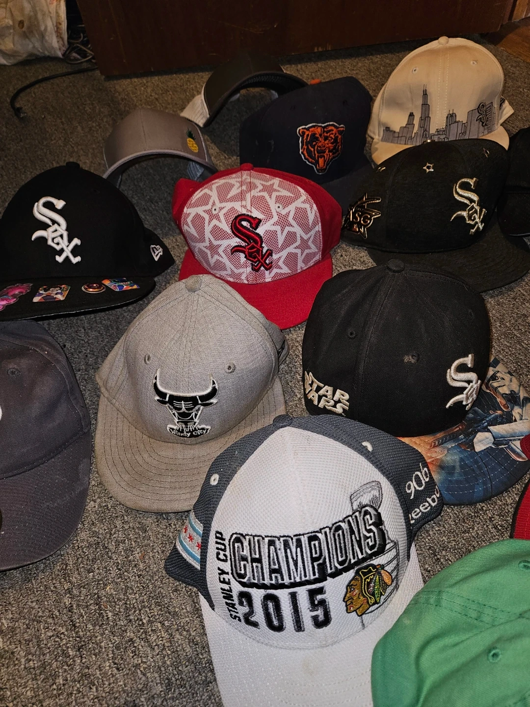 Collection of various baseball caps including Chicago Bulls, Chicago White Sox, and Star Wars themes. Different styles and colors are available. 15 hats total asking $50.00 for all cash and pick up only
