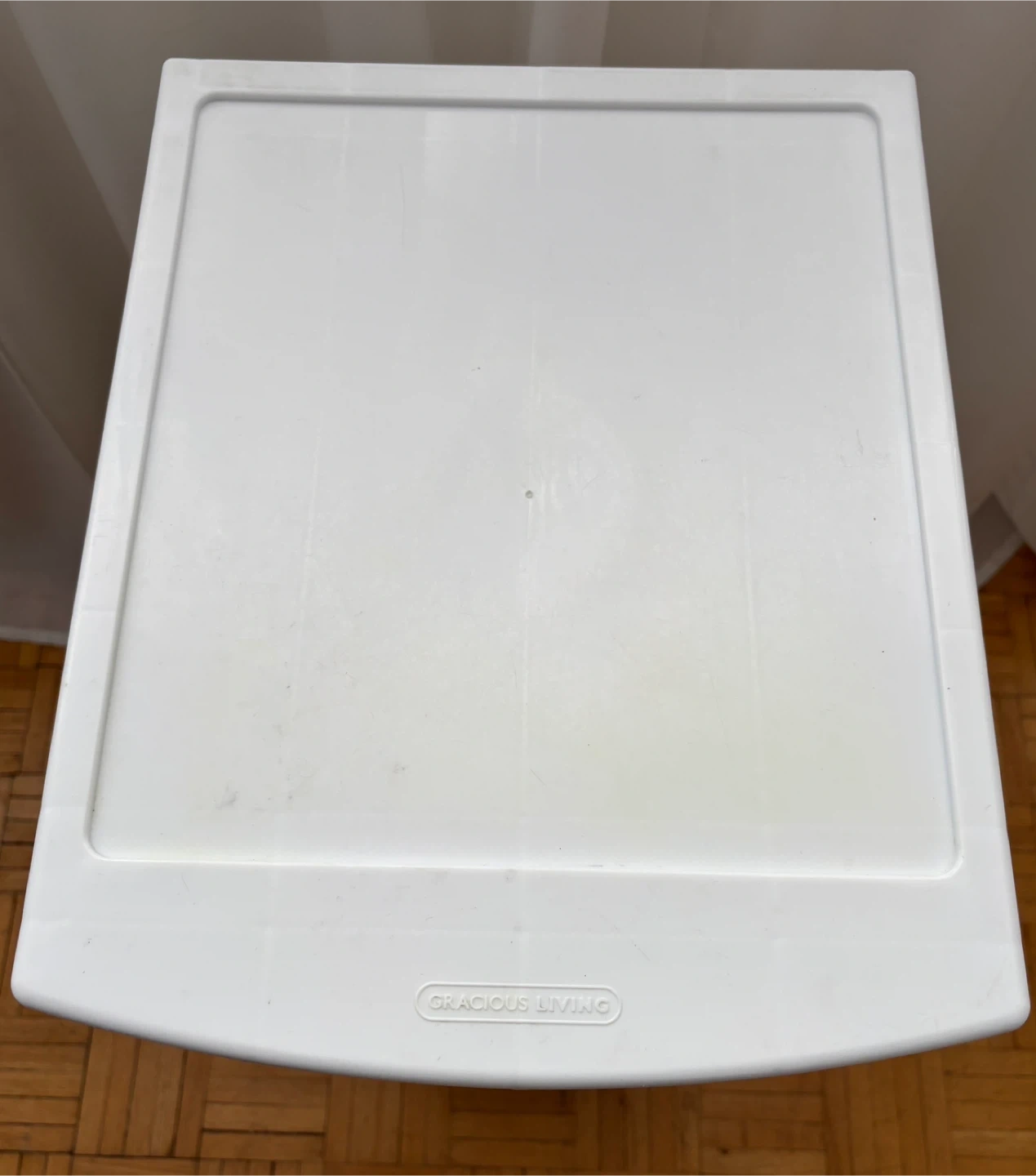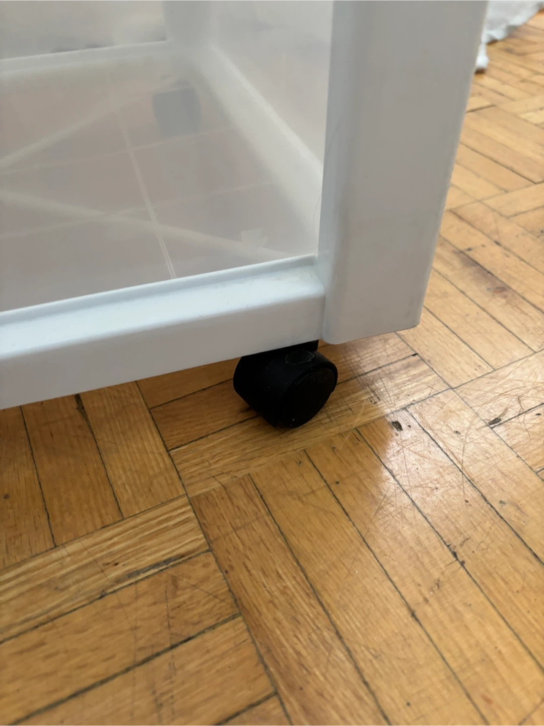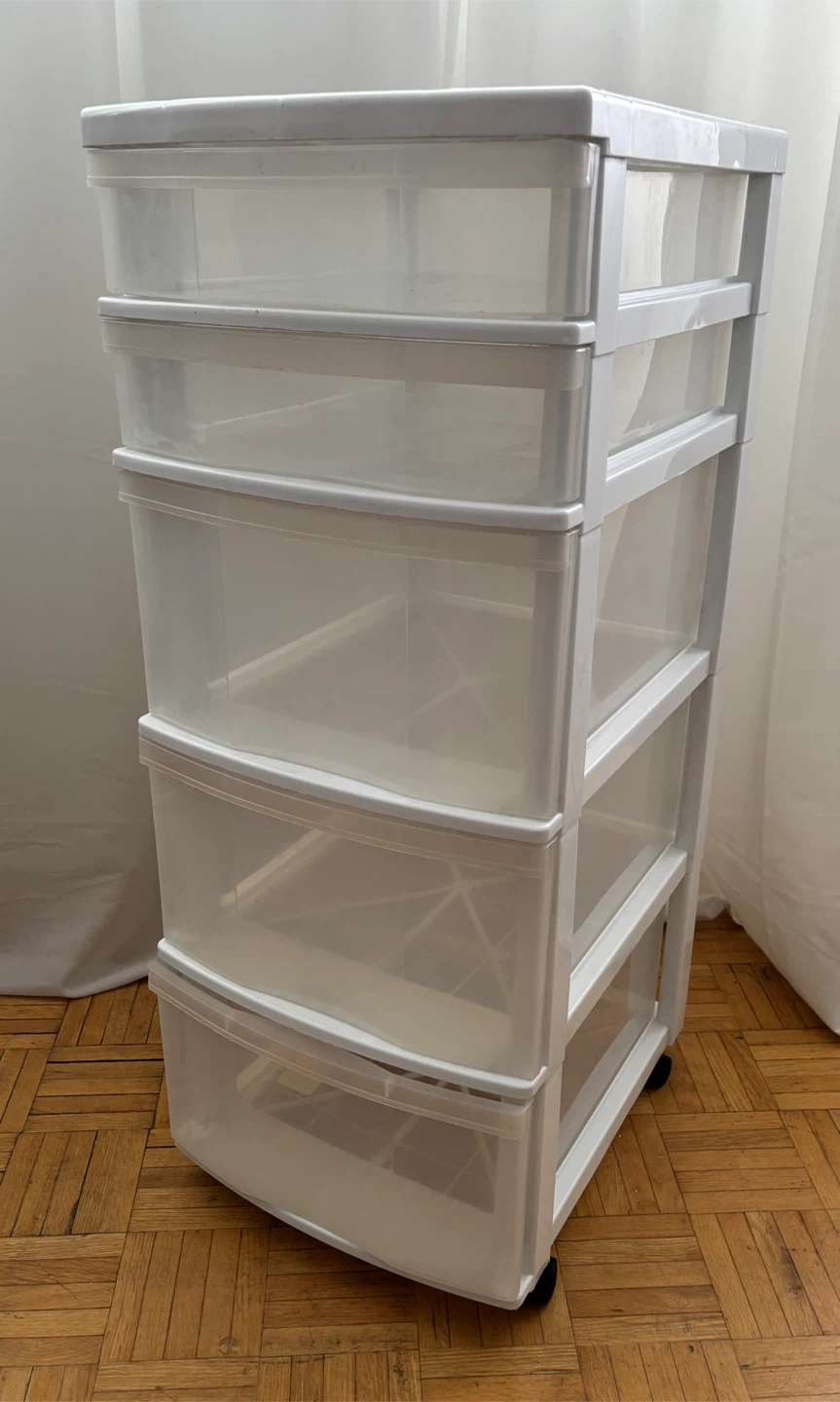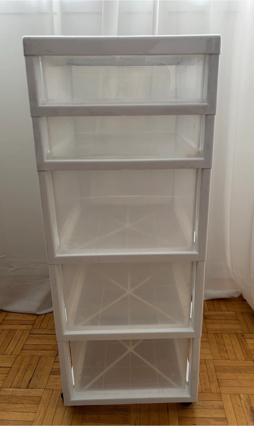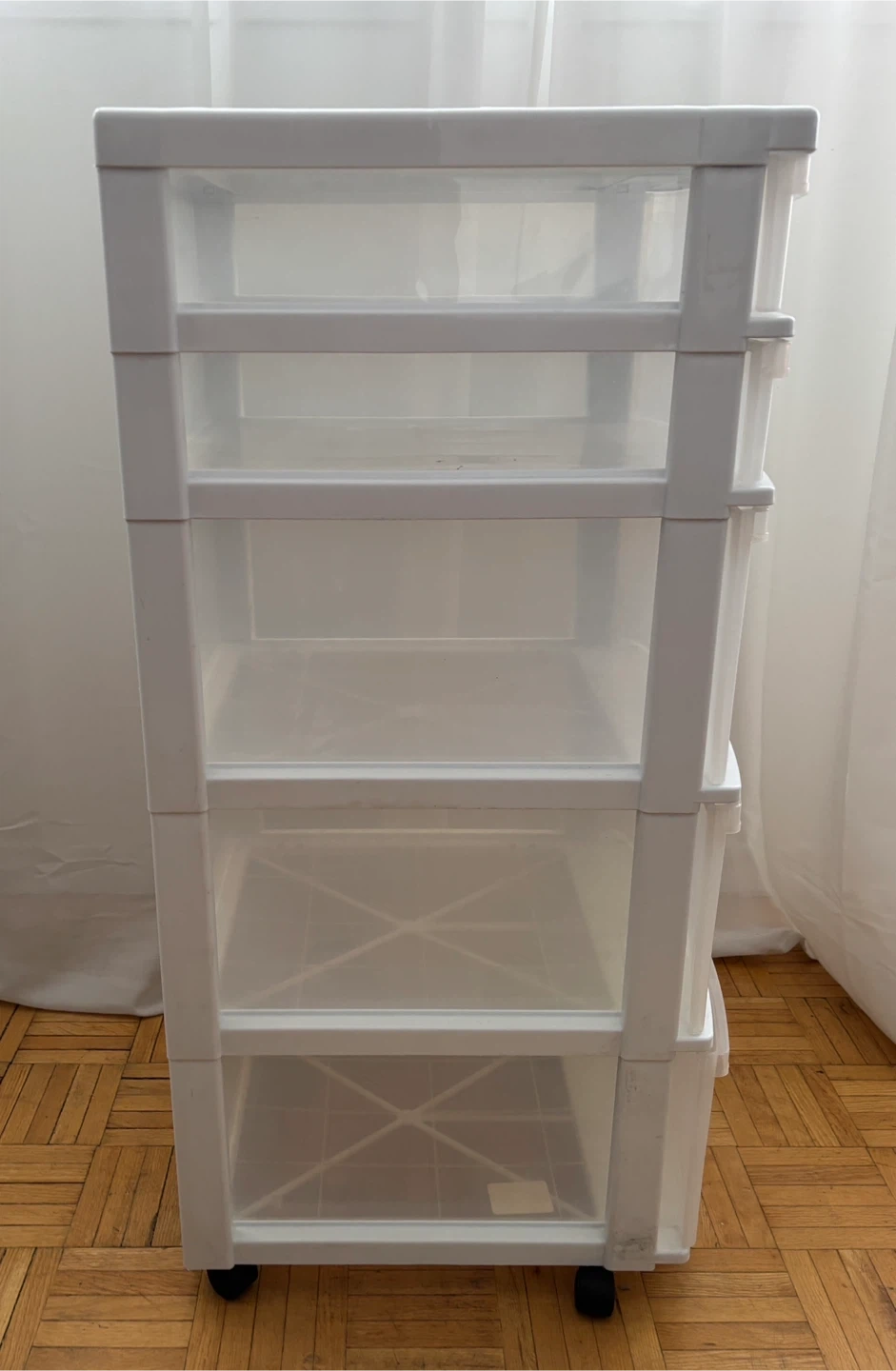 White Gracious Living storage unit on wheels with five clear drawers in great condition.