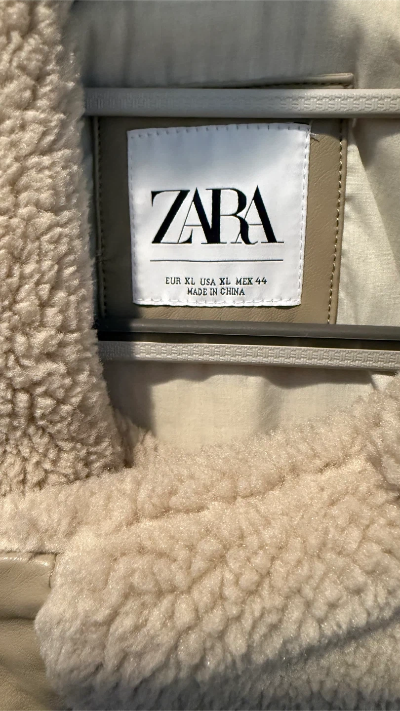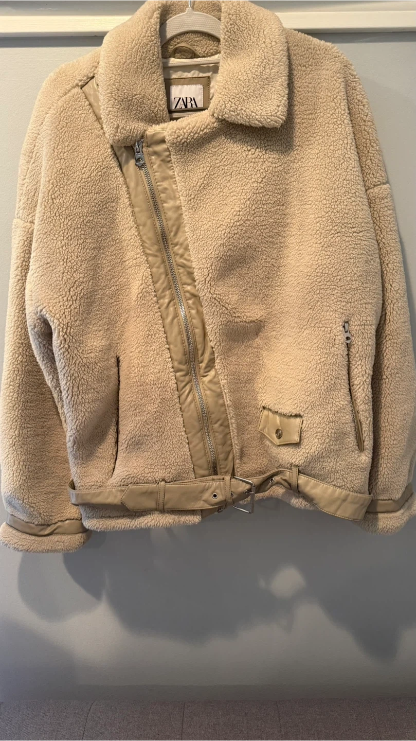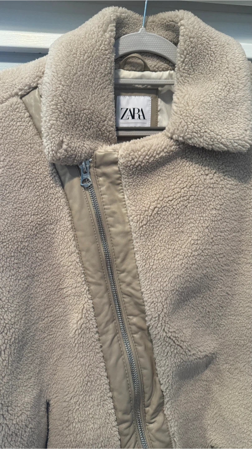 Cozy up in this Zara sherpa jacket! It's a size XL and features a stylish asymmetrical zipper and faux leather accents. Perfect for adding a touch of warmth and style to your wardrobe