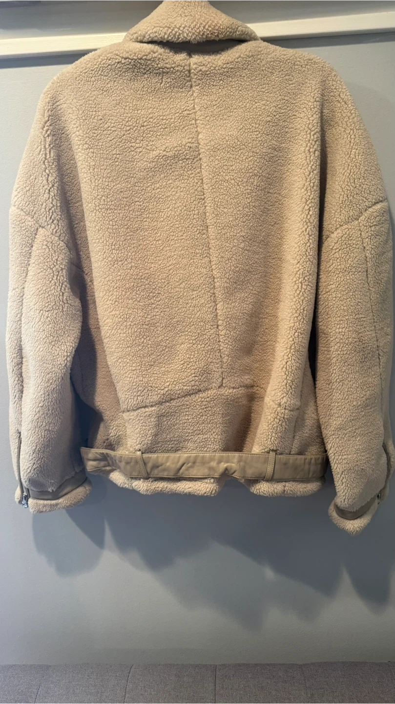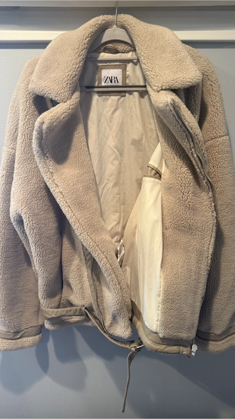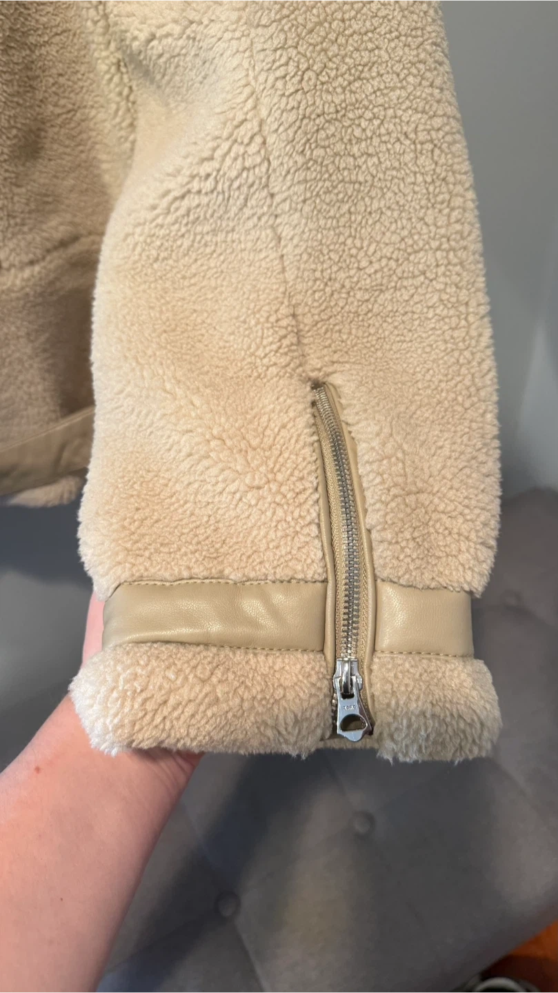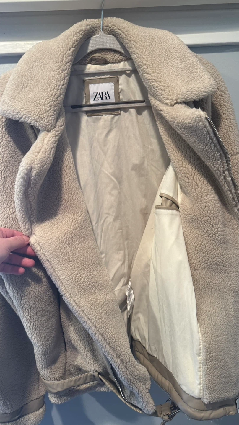 Cozy up in this Zara sherpa jacket! It's a size XL and features a stylish asymmetrical zipper and faux leather accents. Perfect for adding a touch of warmth and style to your wardrobe