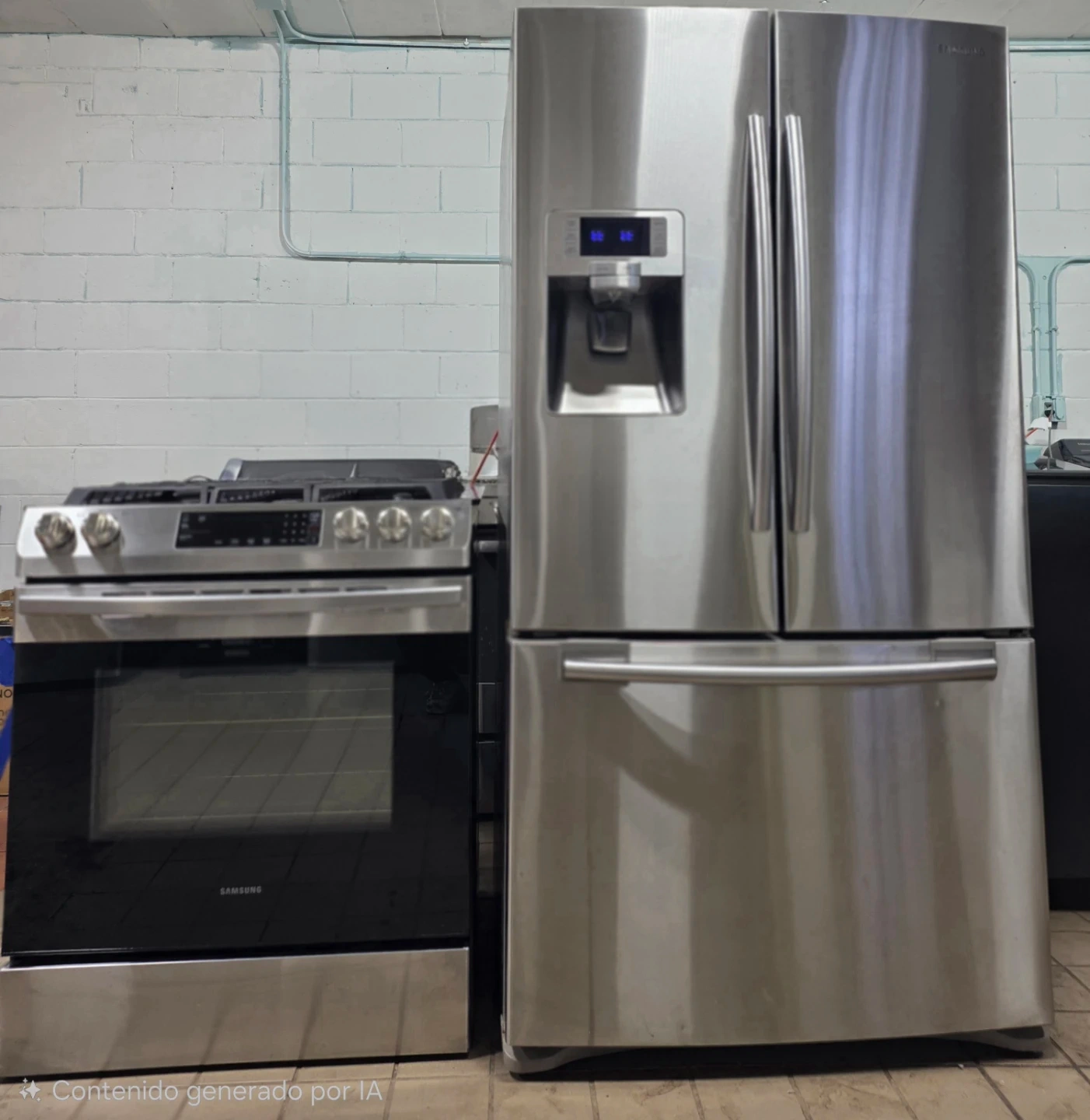 Se venden una cocina de gas y un frigorรญfico Samsung de acero inoxidable. listos para una nueva cocina. La cocina tiene una elegante placa de cocciรณn negra y acabado de acero inoxidable, mientras que el frigorรญfico es un espacioso modelo de puertas francesas.