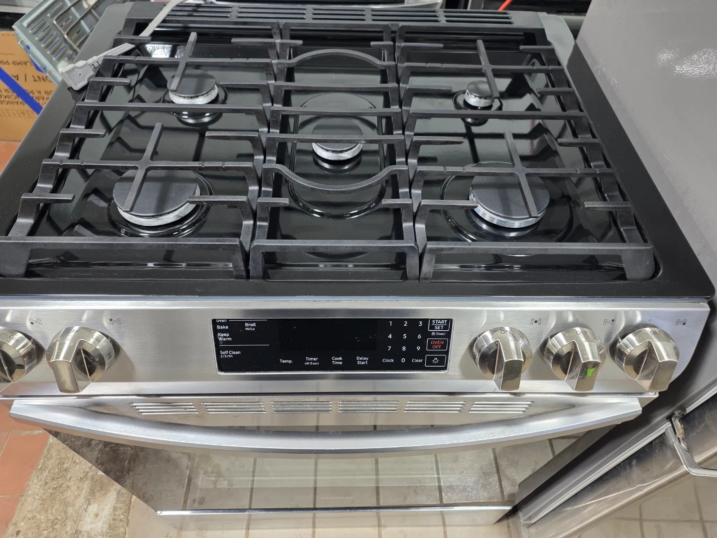 A gas range and a Samsung stainless steel refrigerator are for sale, ready for a new kitchen. The range features a sleek black cooktop and stainless steel finish, while the refrigerator is a spacious French door model. Includes: