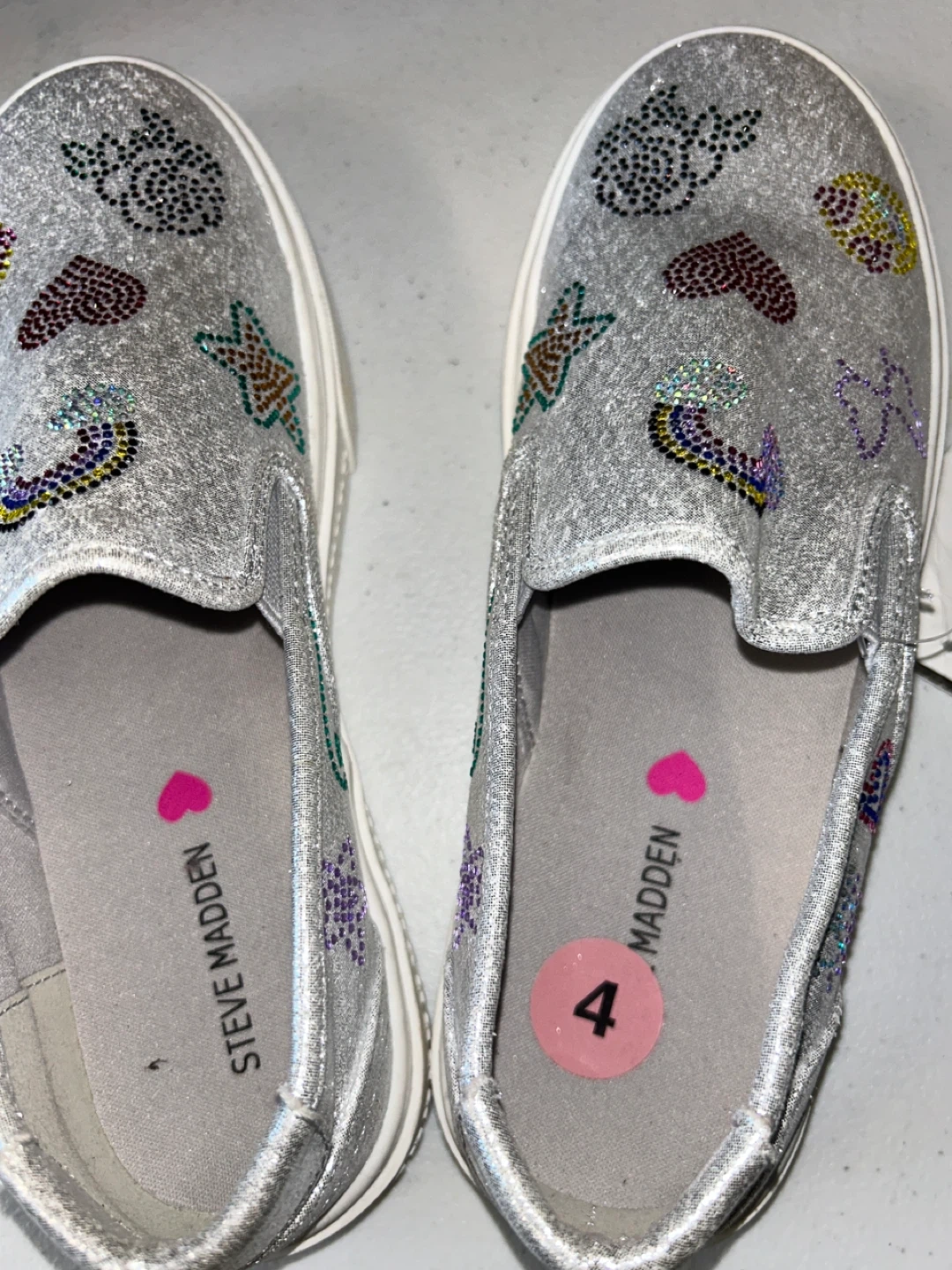 These Steve Madden girl's slip-on shoes are super cute! They're a size 4 and feature a glittery silver design with colorful gem embellishments like rainbows, hearts, stars, and more