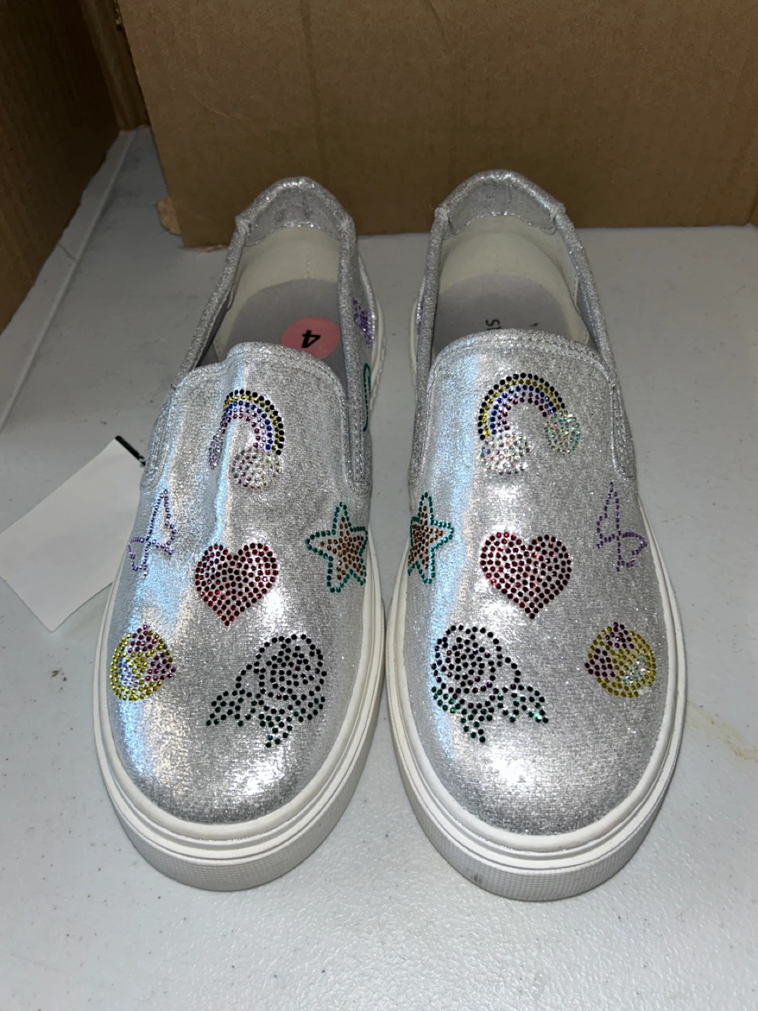 These Steve Madden girl's slip-on shoes are super cute! They're a size 4 and feature a glittery silver design with colorful gem embellishments like rainbows, hearts, stars, and more