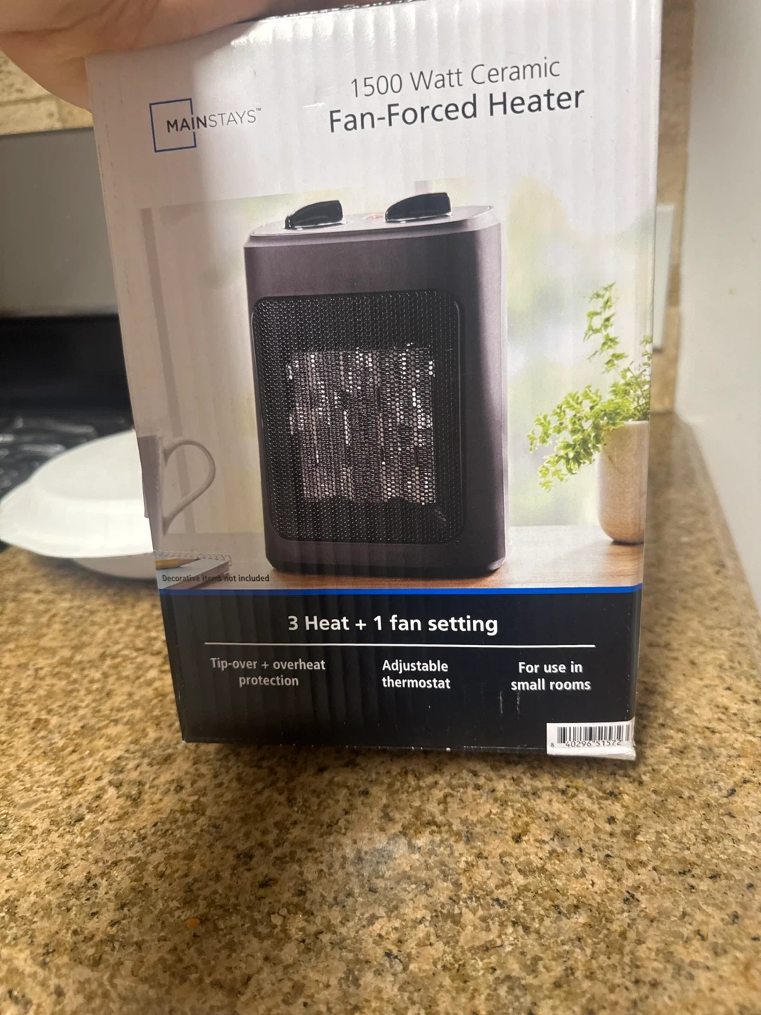 This is a Mainstays 1500 Watt Ceramic Fan-Forced Heater. It offers 3 heat settings and 1 fan setting. It features tip-over and overheat protection, plus an adjustable thermostat. It's designed for use in small rooms!