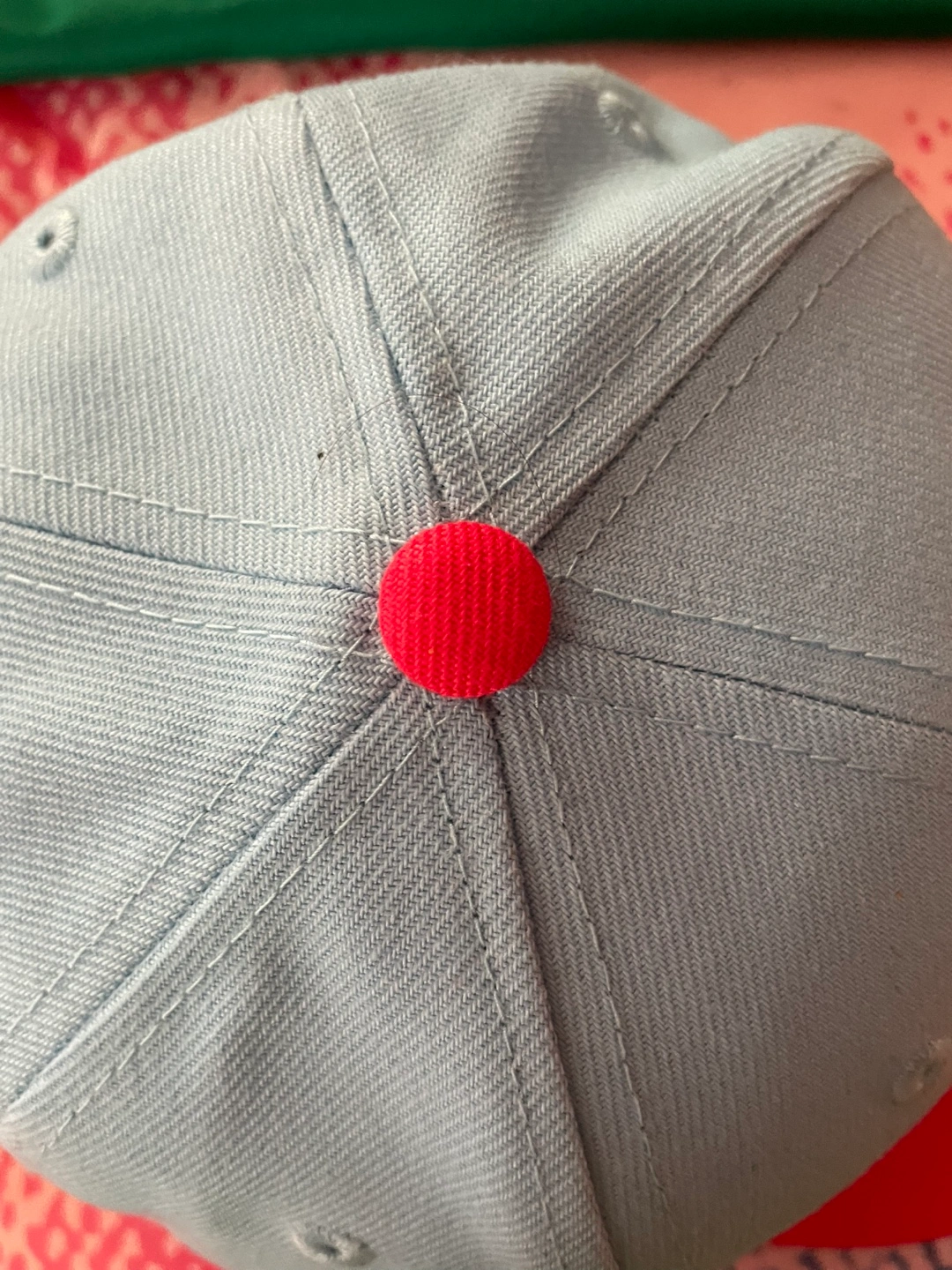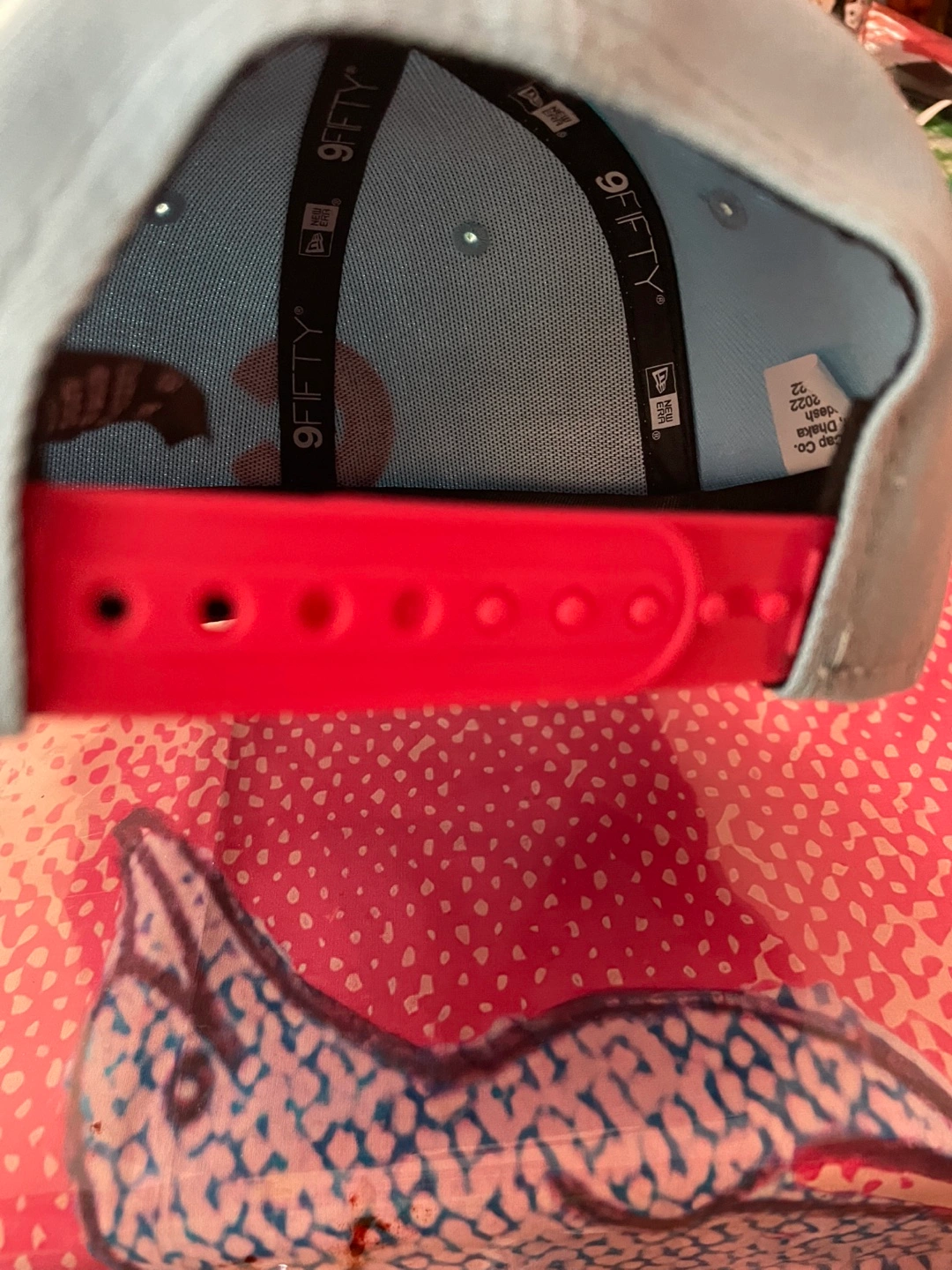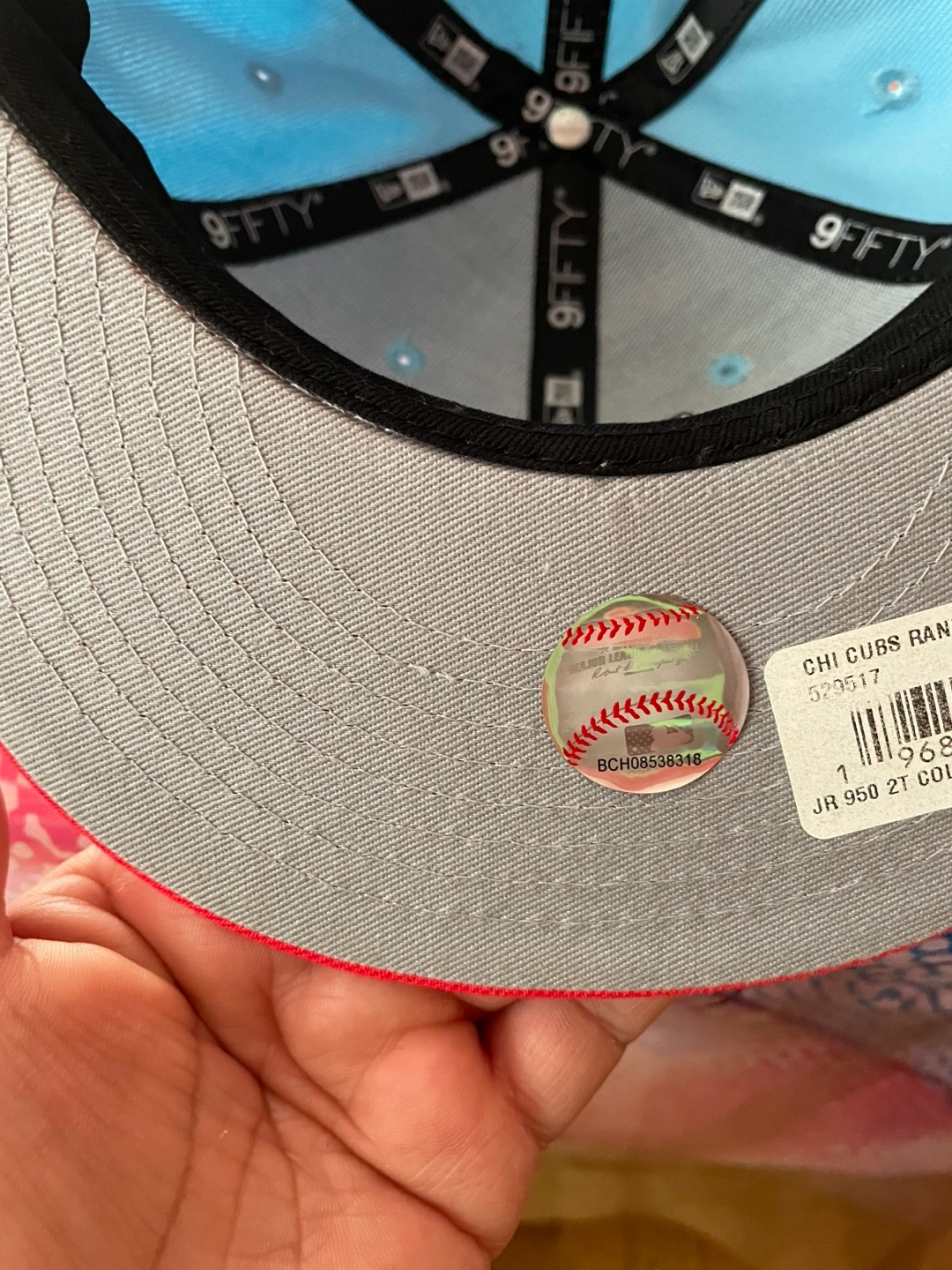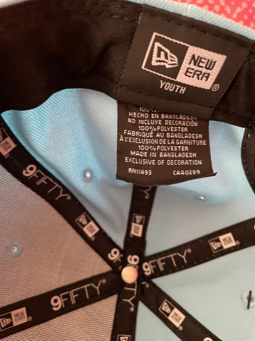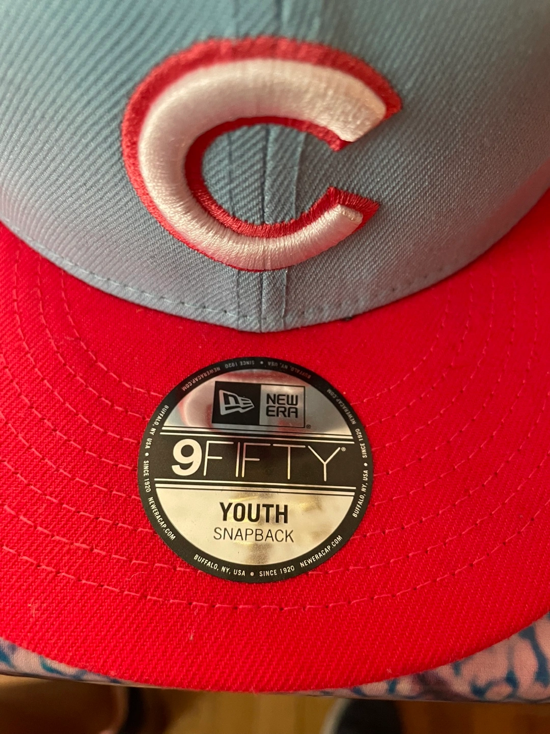 Here's a New Era 9FIFTY youth hat featuring the Chicago Cubs! It's a light blue color with a red button on top and a red adjustable strap in the back. The material is 100% polyester