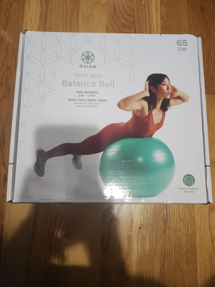 Selling a Gaiam Total Body Balance Ball, sized at 65cm! It's ideal for heights between 5'6" and 5'11". This full-body tool is great for working your abs, back, glutes, hips, arms, and more. A digital workout is included, and it comes in its original box