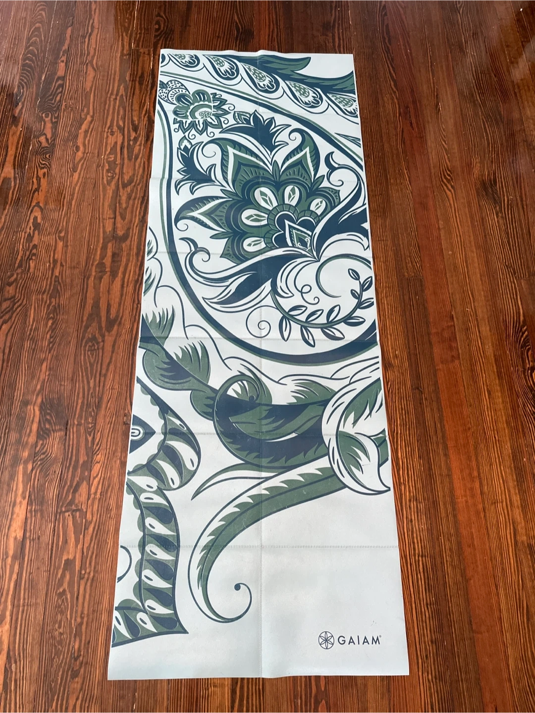 Selling a Gaiam yoga mat in good condition. It features a beautiful floral design in shades of green and blue. Perfect for your home workouts!