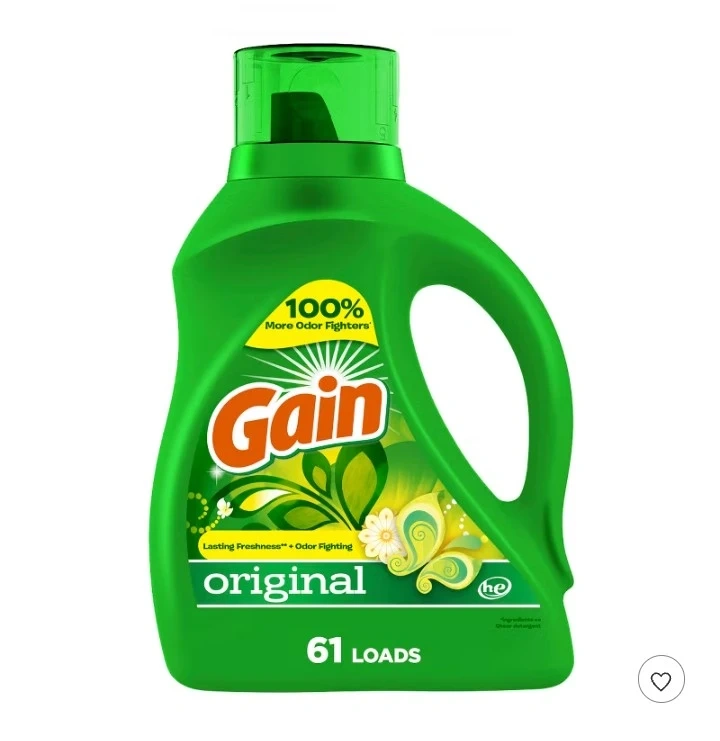 10Get your clothes smelling fresh with this Gain Original scent laundry detergent! This bottle contains enough detergent for 61 loads of laundry. It is designed to provide lasting freshness and odor fighting power for your clothes. Perfect for keeping your wardrobe clean and smelling great! 88oz bottle