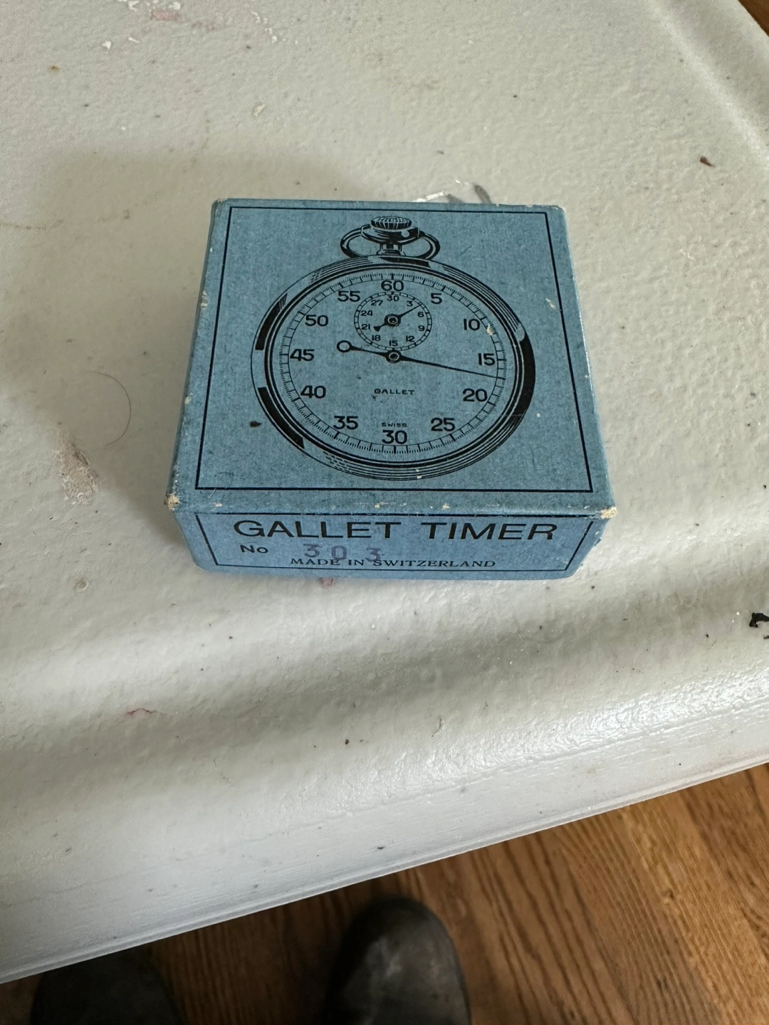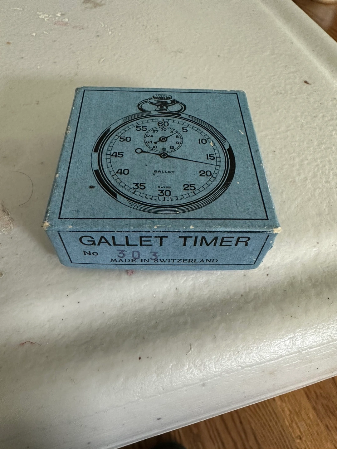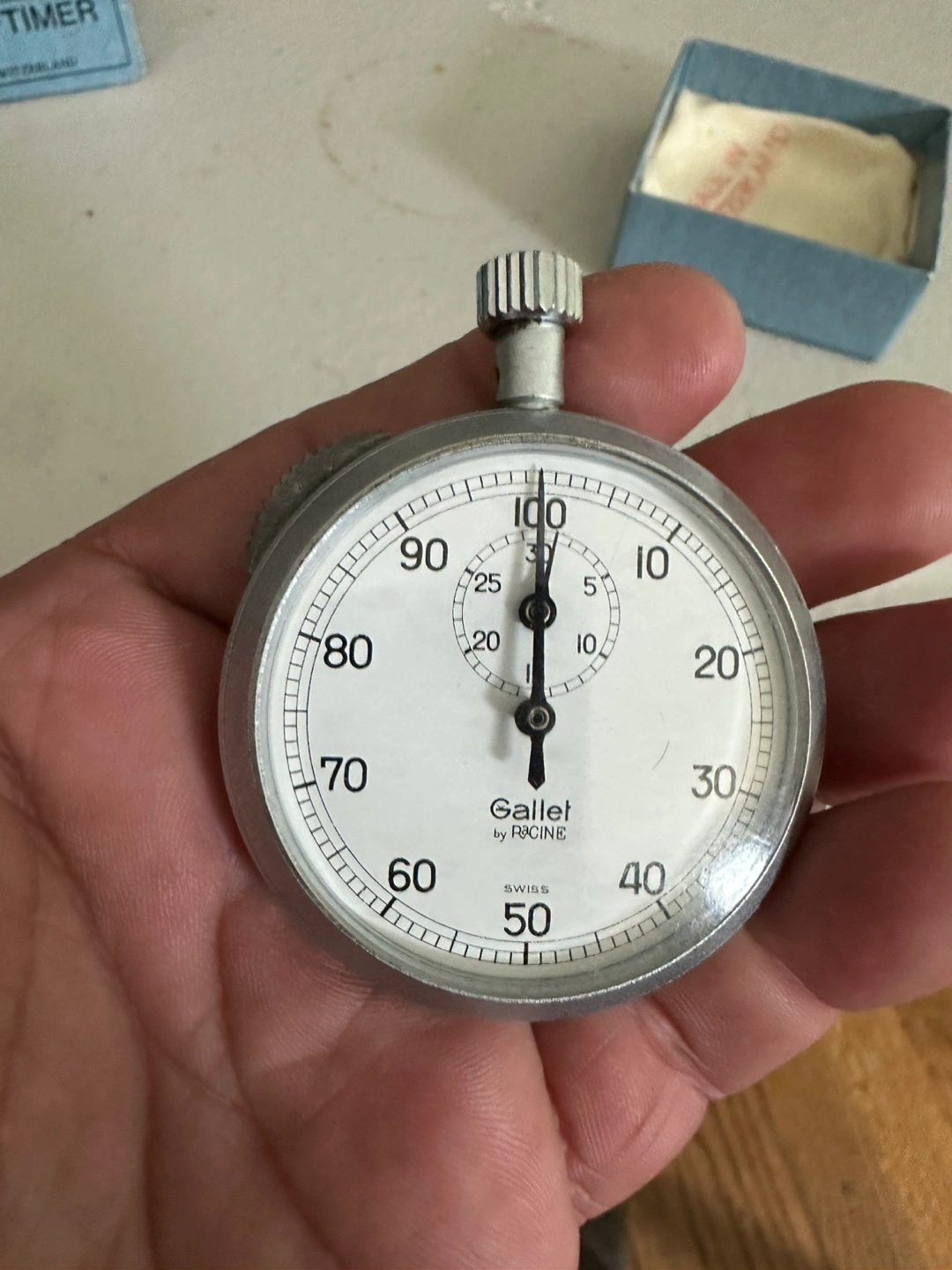 130Selling a Gallet by Racine timer. It's a stopwatch-style timer, marked 'Swiss Made'. Comes with its original box!