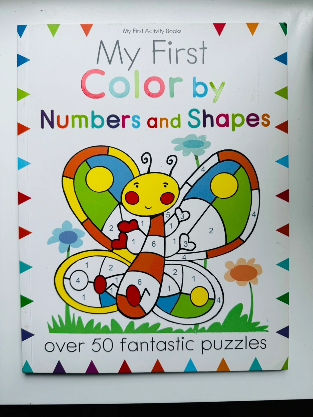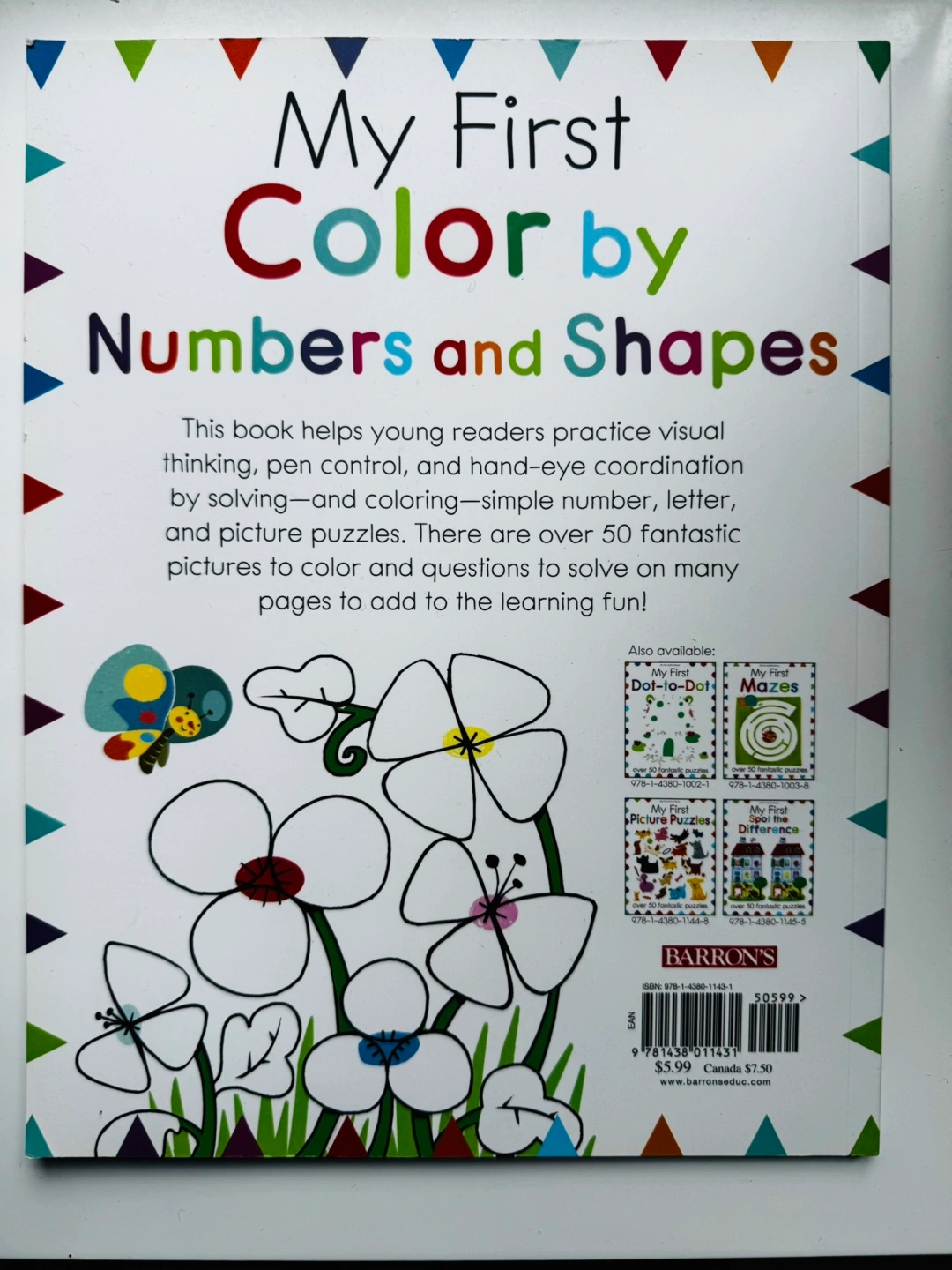 Color by numbers activity book. Over 50 puzzles. Helps young readers practice visual thinking, pen control, and hand-eye coordination. Simple number, letter, and picture puzzles.