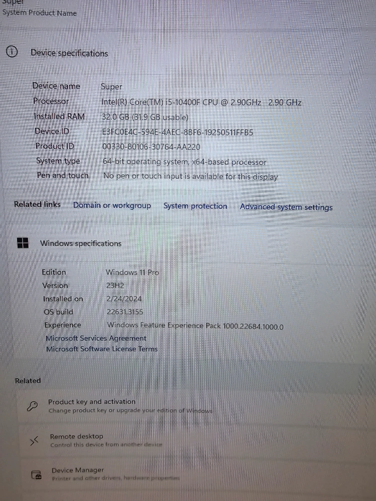 115CPU : i5 - 10440F 2.9 Ghz RAM : 32 Gb DDR 4 GPU : Nvidia GeForce GTX 1660 Super DRIVE : m2 ssd samsung 980 1tb Board : ASUS Prime B560M-A Power : ASUS ROG-STRIX-550G 550W Window 11 Pro installed