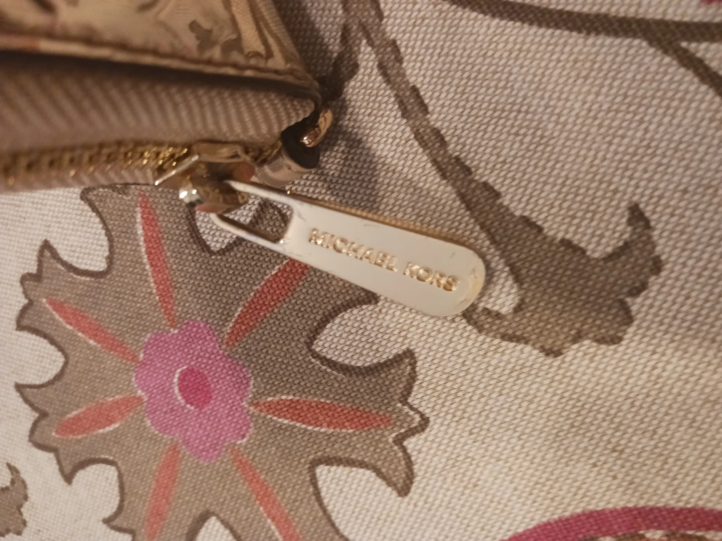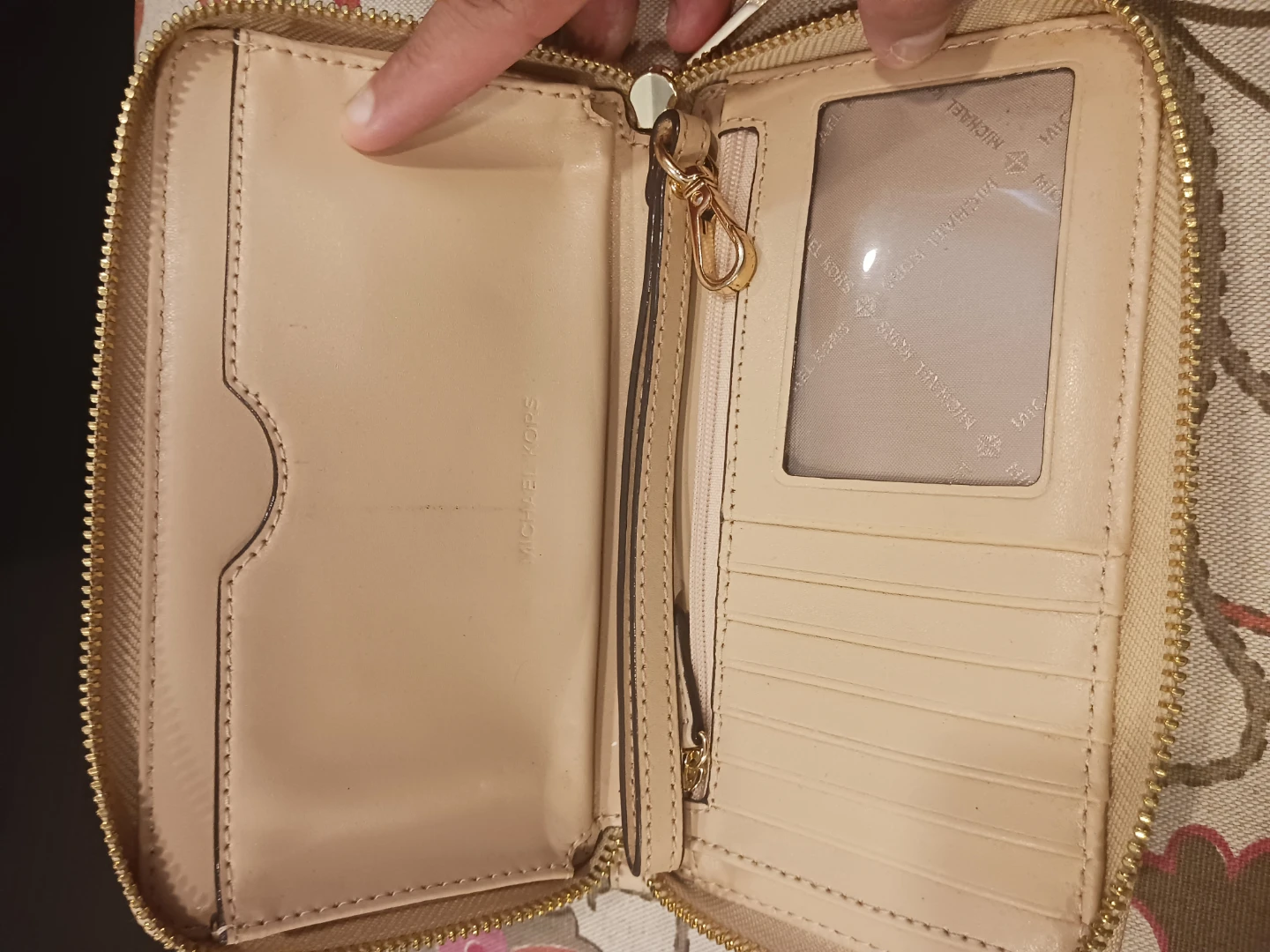 This Michael Kors wallet features a zip-around closure. It's a light tan color with gold-tone hardware. Multiple card slots and a clear ID window are included.