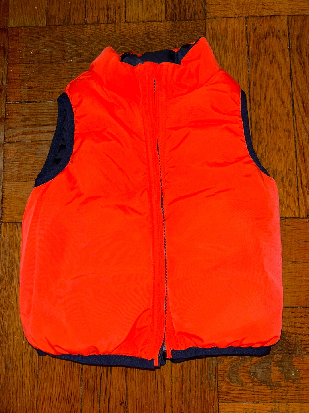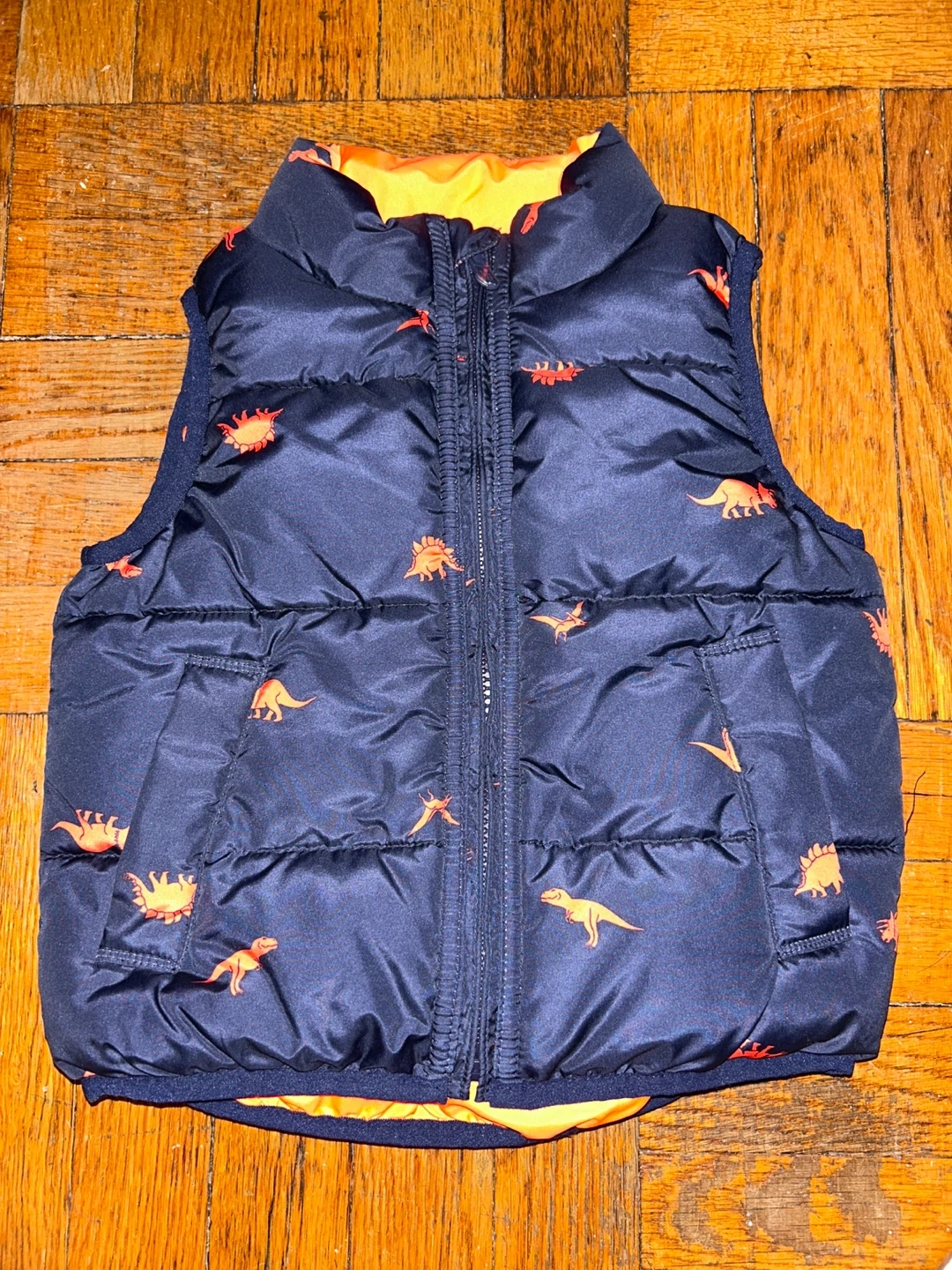 1000+Like two vests in one! This is a Gap Baby reversible puffer vest in size 18-24 months. Navy blue with neon orange dinosaur prints on one side and solid orange on the other. New, never worn.