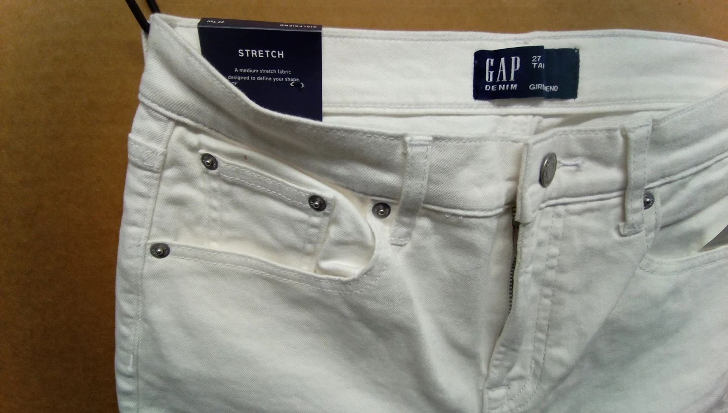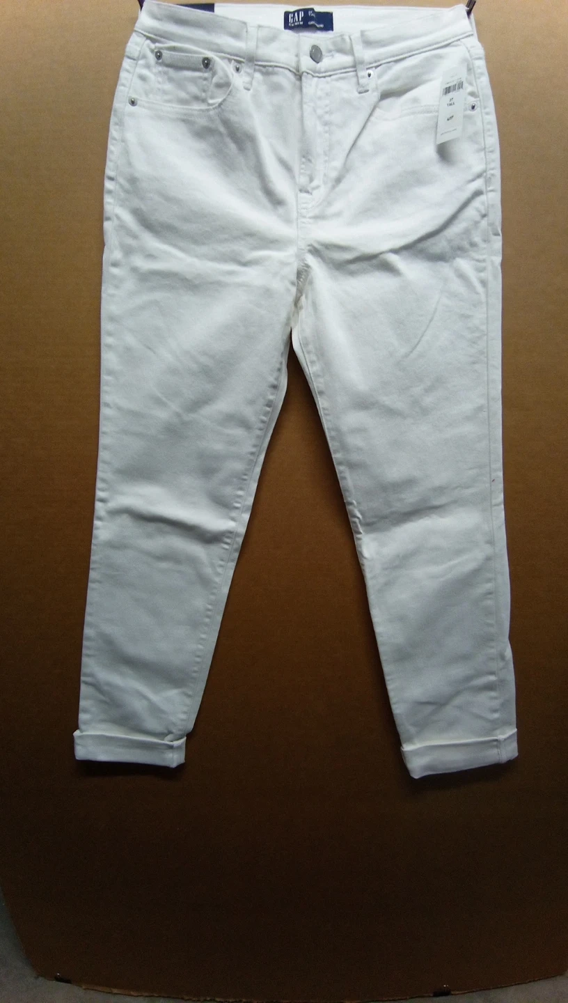 1000+Selling a pair of GAP Denim Girlfriend jeans in white. They are size 27 Tall. These jeans feature a medium stretch fabric designed to define your shape. Perfect for a casual and comfortable look!