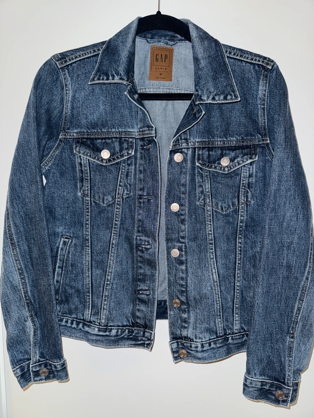 Selling a classic GAP denim jacket in size medium! It's in great condition and perfect for layering or wearing on its own. The jacket features a timeless design with button closures and functional pockets. A versatile addition to any wardrobe!