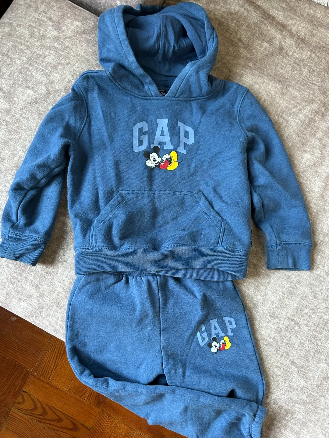 10I have a GAP Disney Mickey Mouse toddler outfit for sale! It includes a blue hoodie and pants set along with two Mickey Mouse t-shirts, one white and one mustard color. Great for your little one! Size 5