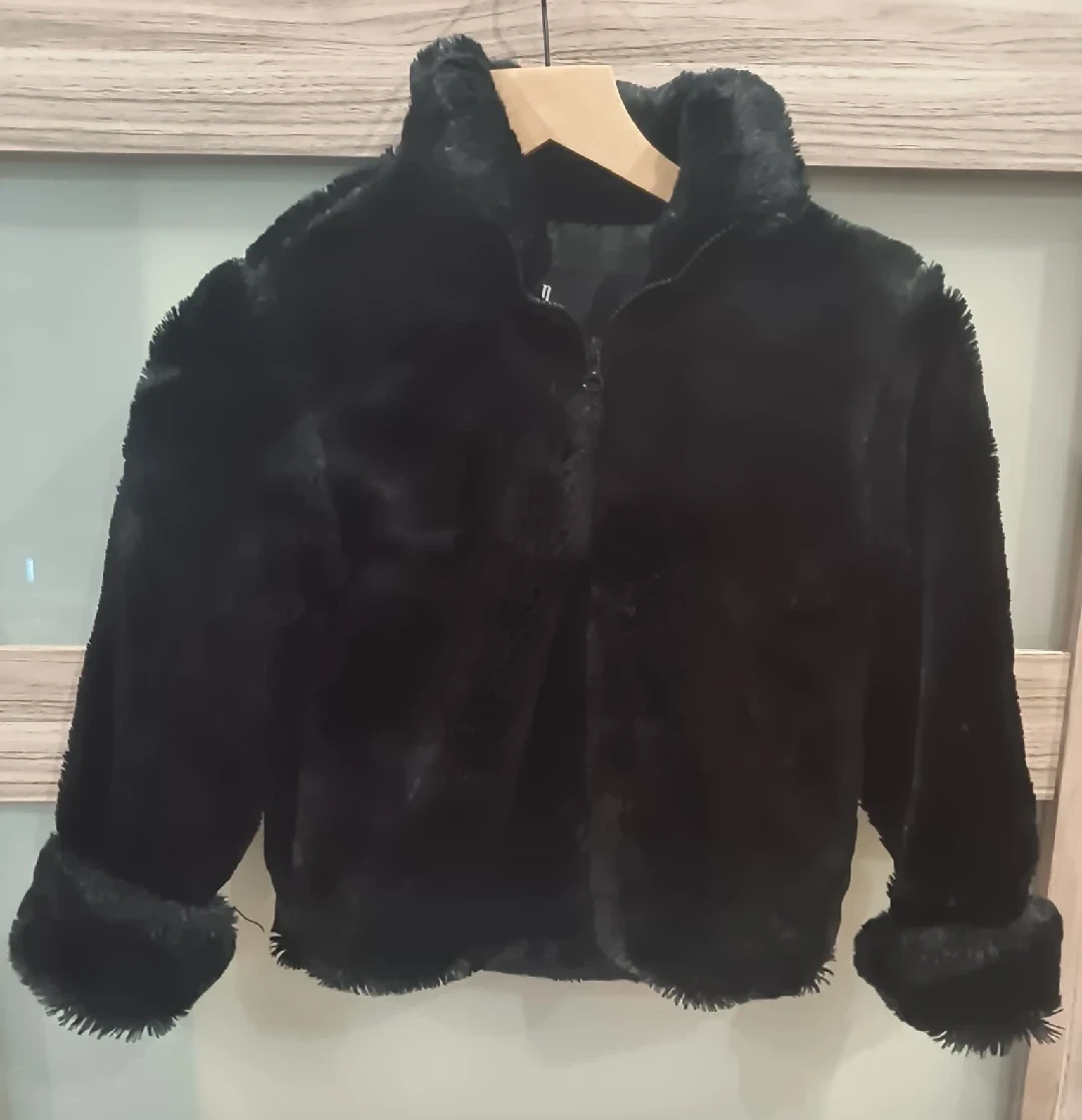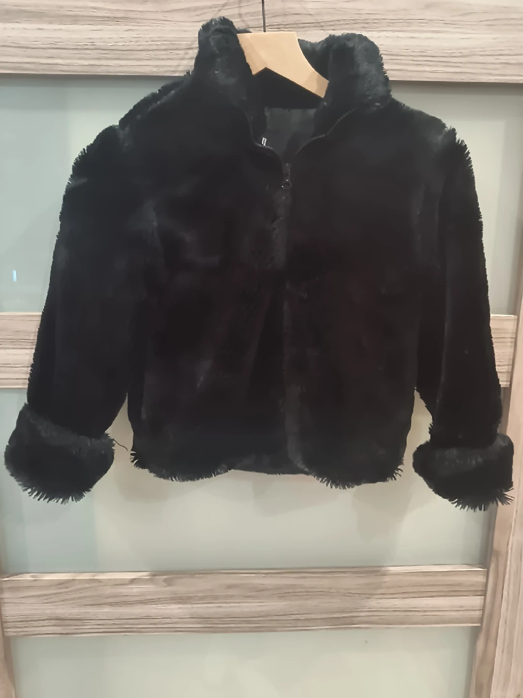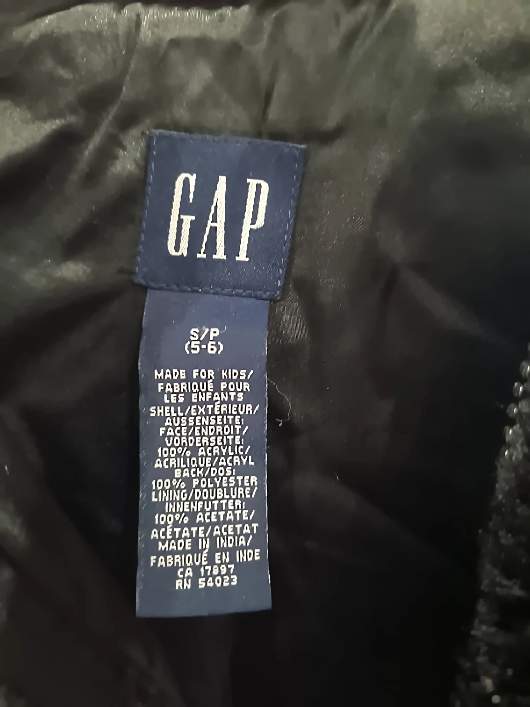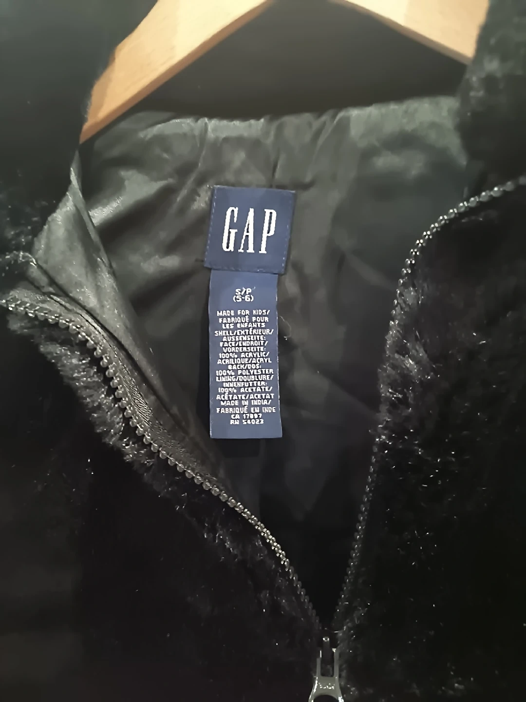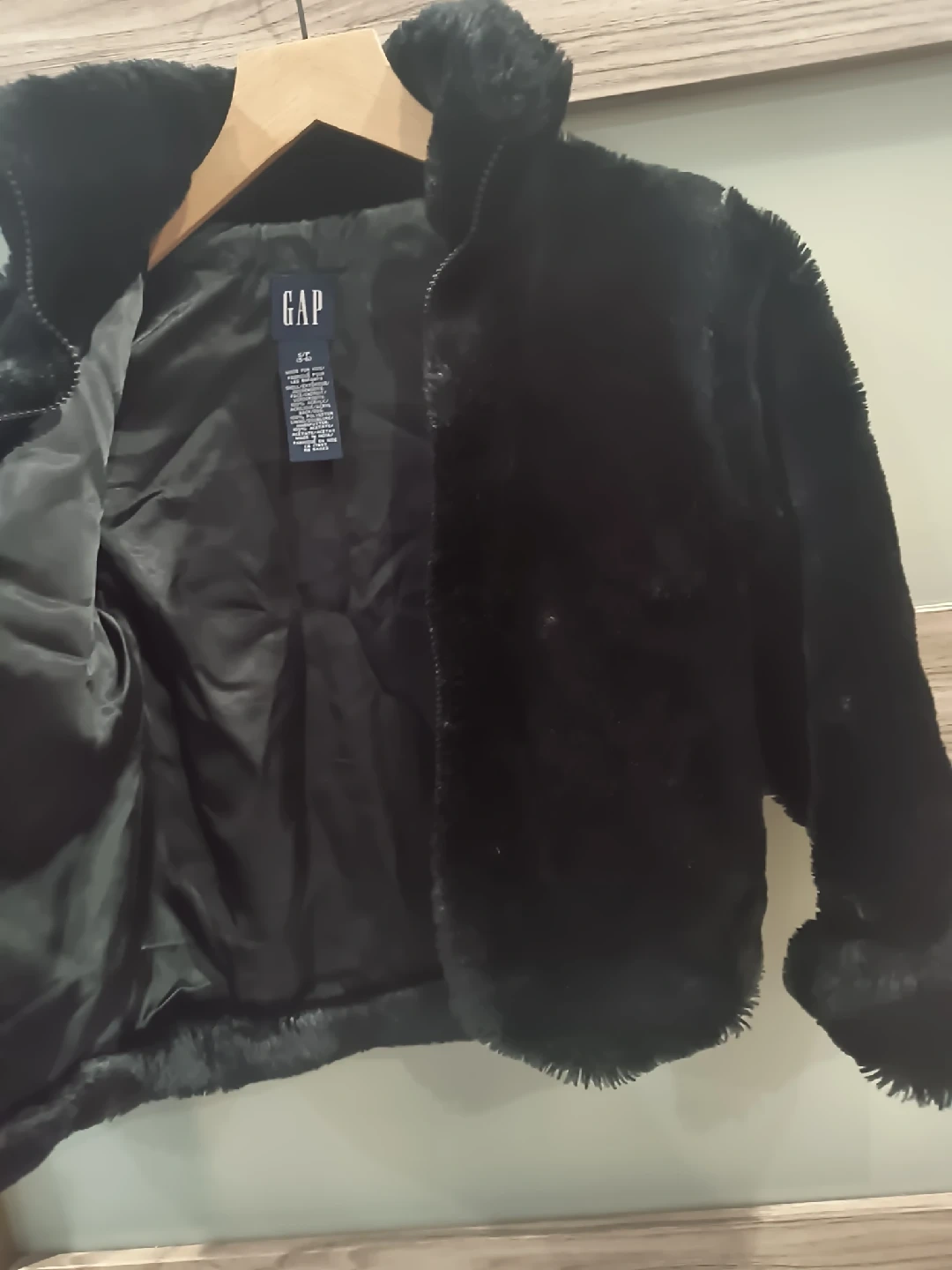 65Selling a gently used GAP kids black faux fur jacket! It's in great condition and perfect for keeping your little one warm and stylish. The size is S (5-6). The jacket is made of 100% acrylic shell and 100% polyester lining