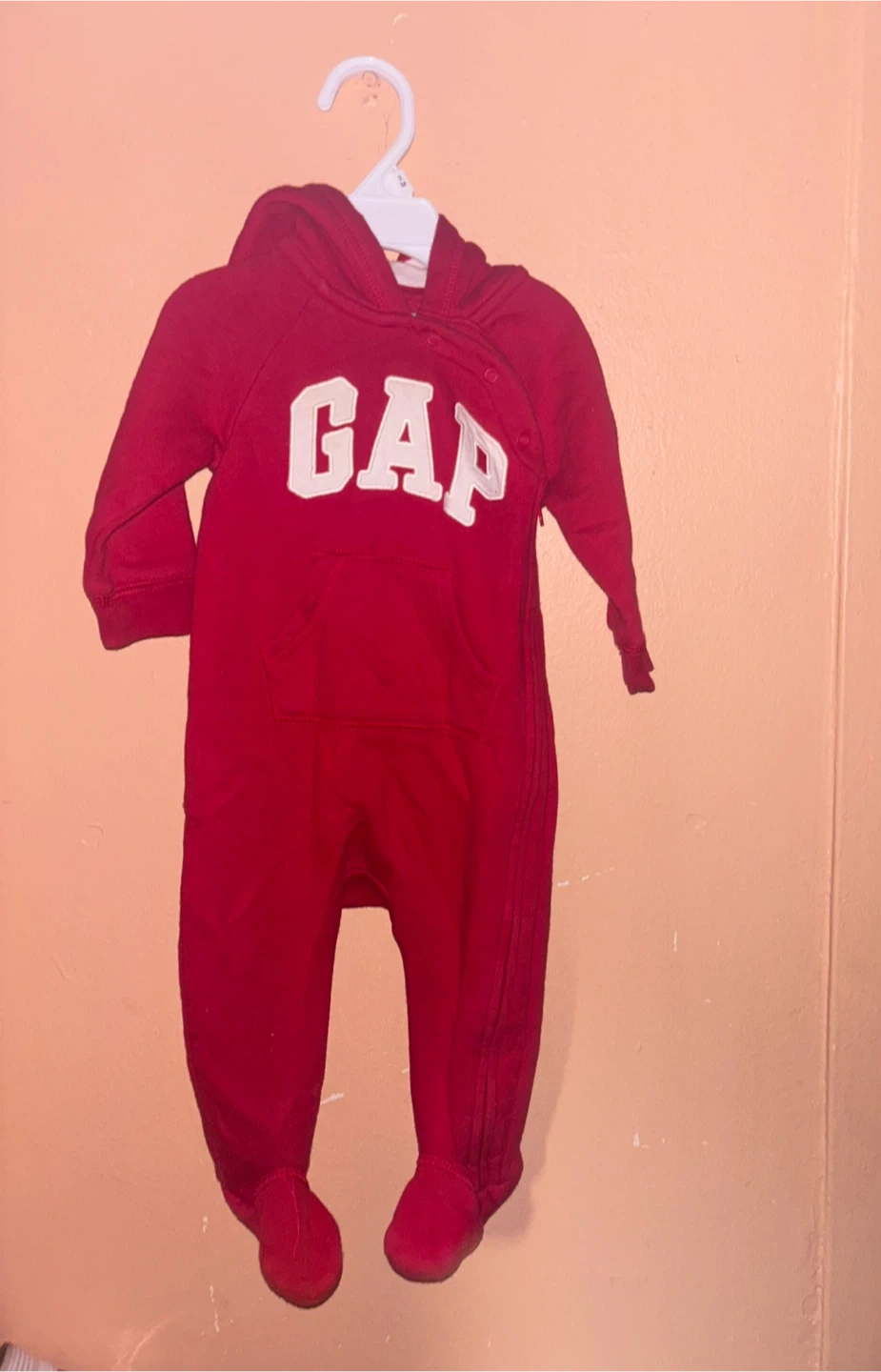 Here's a cute red GAP baby onesie! It has a hood and a little pocket in the front. Perfect for keeping your little one cozy. Size 6-9 months