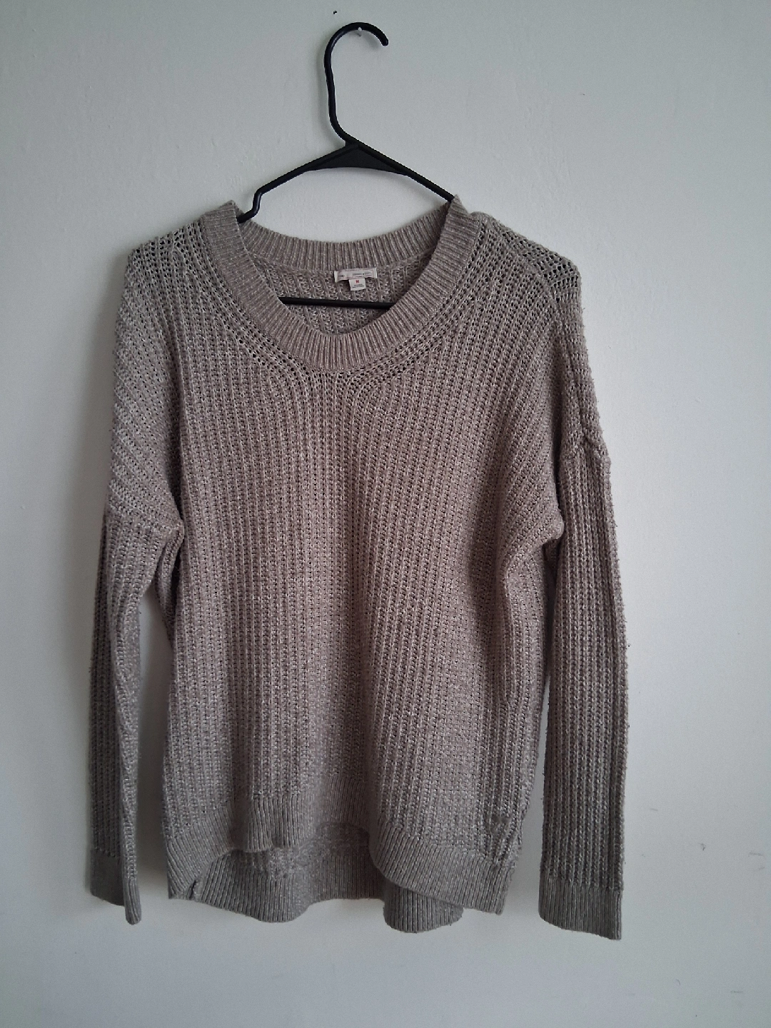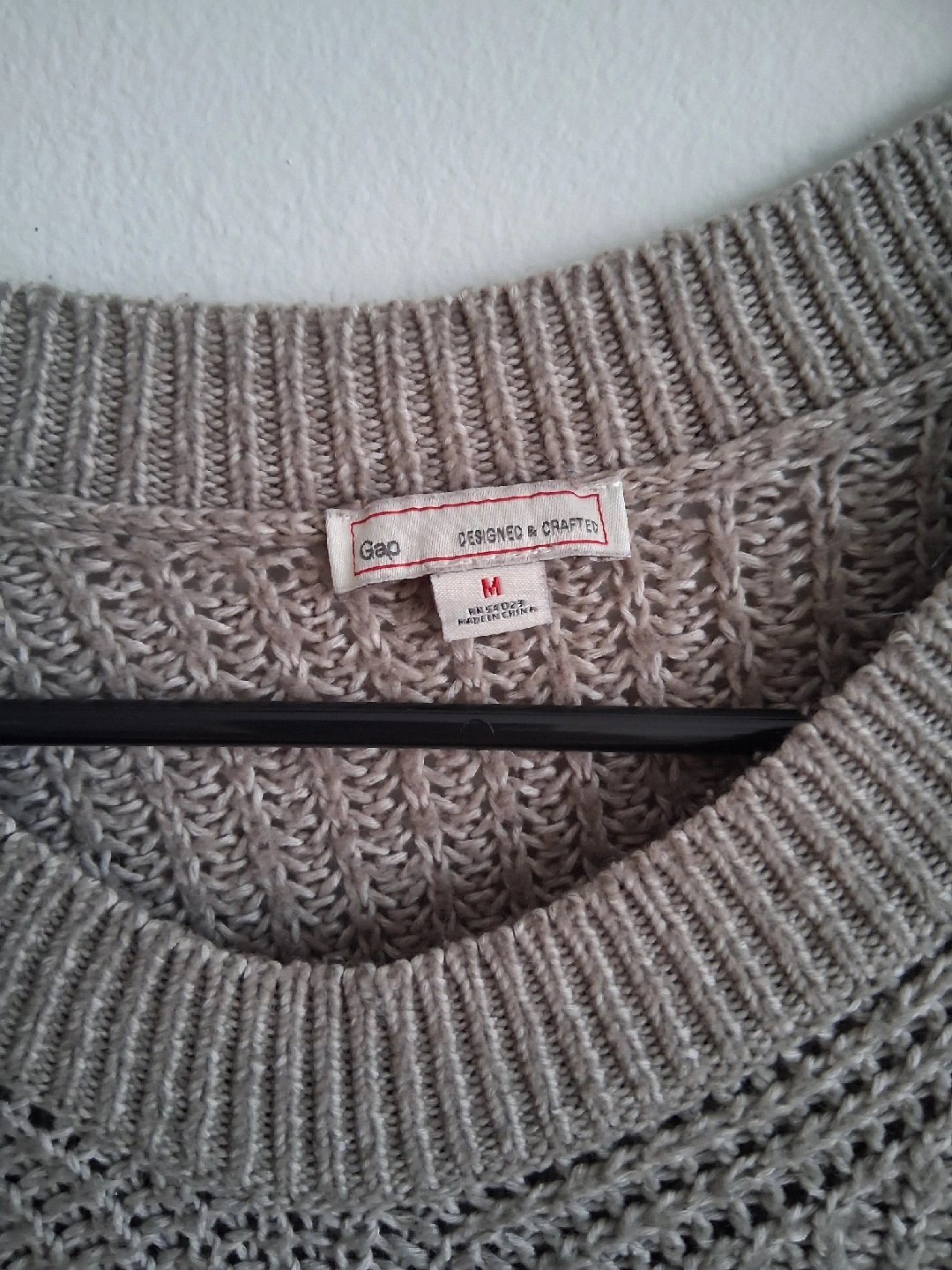 60Cozy Gap sweater in a neutral color, size medium. It's in great condition and perfect for layering or wearing on its own. The knit texture adds a nice touch, and it's super comfy