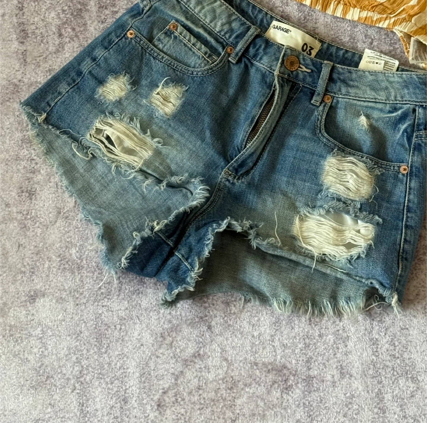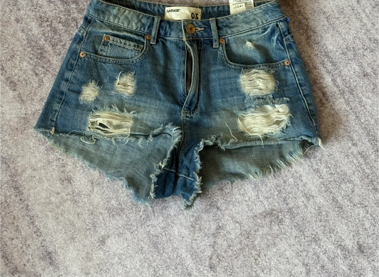 60Garage brand distressed denim shorts in size 3. These shorts have a stylish, worn look with multiple rips and frayed edges. Perfect for a casual, edgy style!