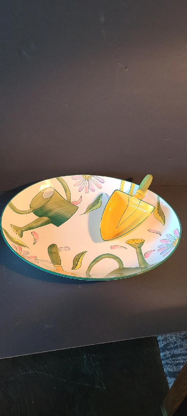 This is a cute serving platter or chip & Dip set with a hand-painted garden theme! It features watering cans, shovels, and daisies. Perfect for serving snacks or displaying as decor