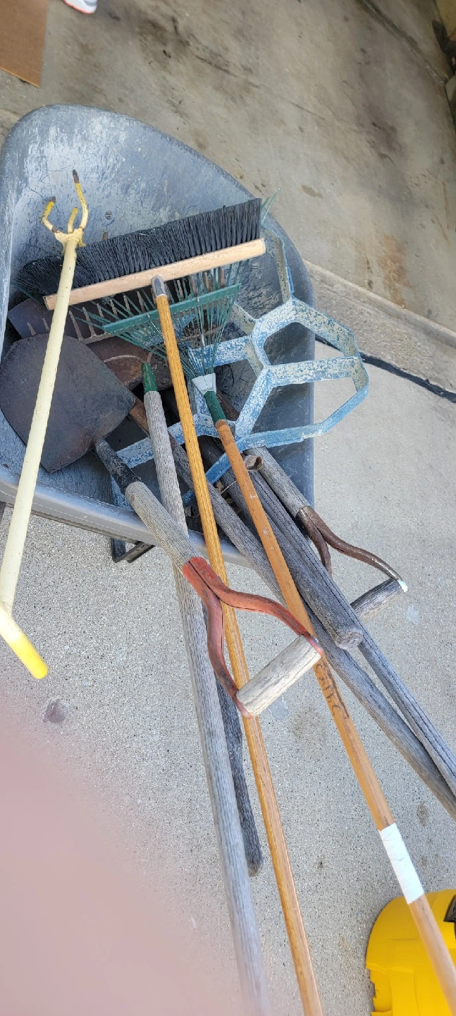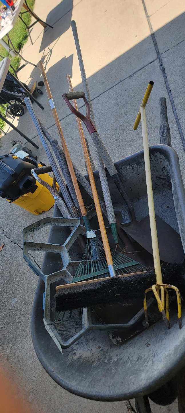 Wheelbarrow full of gardening tools for sale! Includes rakes, shovels, and other various tools. Perfect for getting your garden in shape!